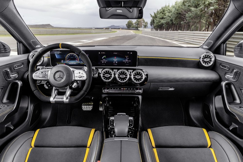 El interior del nuevo A 45 4MATIC+ 2019 es una oda a la deportividad y el estilo, con el sistema MBUX de información y entretenimiento y su doble pantalla como protagonistas. Los asientos están tapizados en cuero Artico y microfibra Dinamica de color negro con costuras dobles, los cuales están acompañados de cinturones de seguridad en color rojo, un color presente en las salidas de ventilación. Una alternativa es el símil de cuero Artico gris y negro con costura doble. En cuanto a la versión S, los detalles pasan de rojo a amarillo, con la consola en negro brillante, pedales de acero inoxidable, alfombrillas y diferentes logotipos AMG repartidos por la cabina.