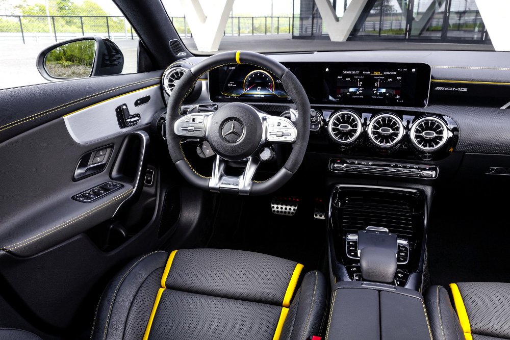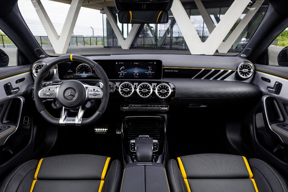 En el interior, el Mercedes CLA (prueba) más potente de la gama, presenta asientos deportivos con tapicería de cuero Artico y microfibra Dinamica en color negro. Diferentes detalles, como las salidas de ventilación, las costuras o los cinturones de seguridad, se presentan en color rojo y amarillo, mientras que la consola central en negro brillante, el volante AMG Performance o el sistema de infoentretenimiento MBUX con doble pantalla, son parte del equipamiento.