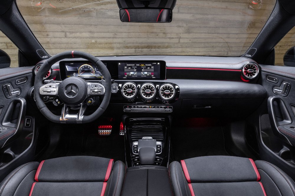 Una vez en el interior del CLA 45 4MATIC+ Shooting Brake, los compradores encontrarán asientos deportivos de microfibra y piel sintética con costuras en contraste de color rojo, un color también presente en los cinturones de seguridad. Los detalles en negro brillante y las salidas de aire cromadas con detalles en rojo también forman parte del estilo interior. En la variante S de la versión más deportiva del nuevo Mercedes CLA Shooting Brake, estos detalles en rojo han sido reemplazados por el color amarillo. Se ofrece también un volante AMG Performance terminado en microfibra, al igual que los paneles de las puertas, y el sistema MBUX es el protagonista, con funciones añadidas propias de un vehículo AMG.