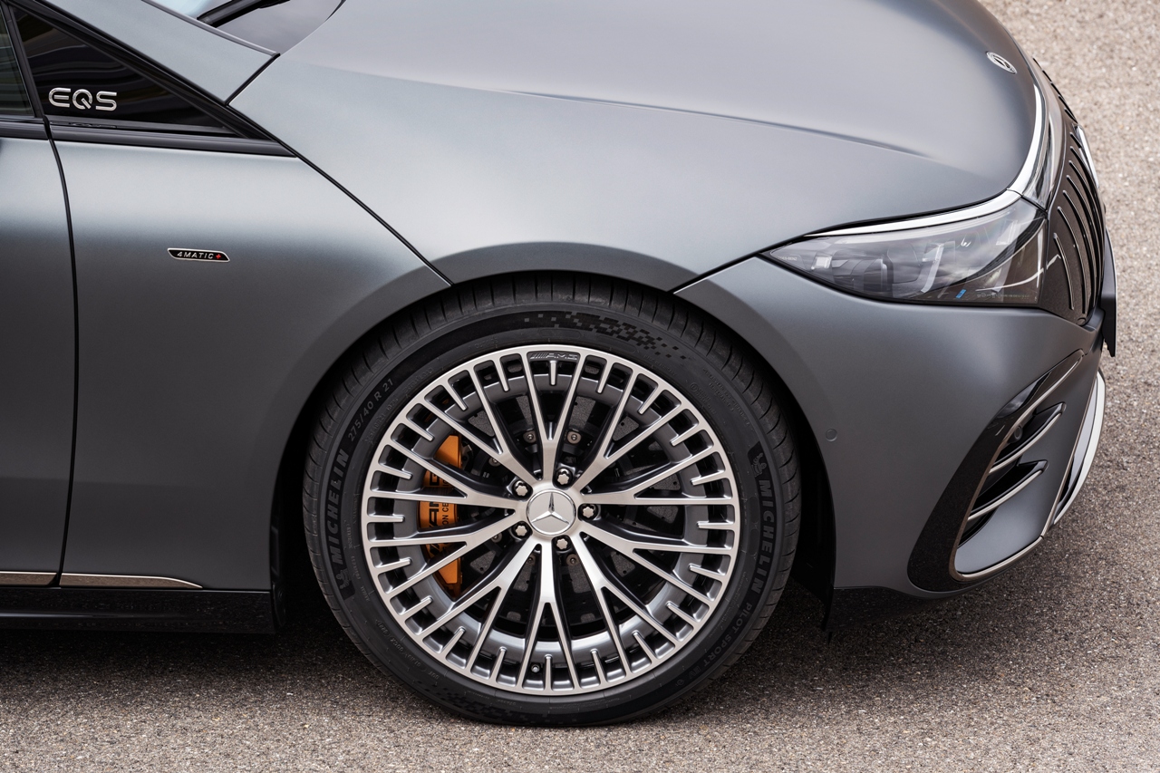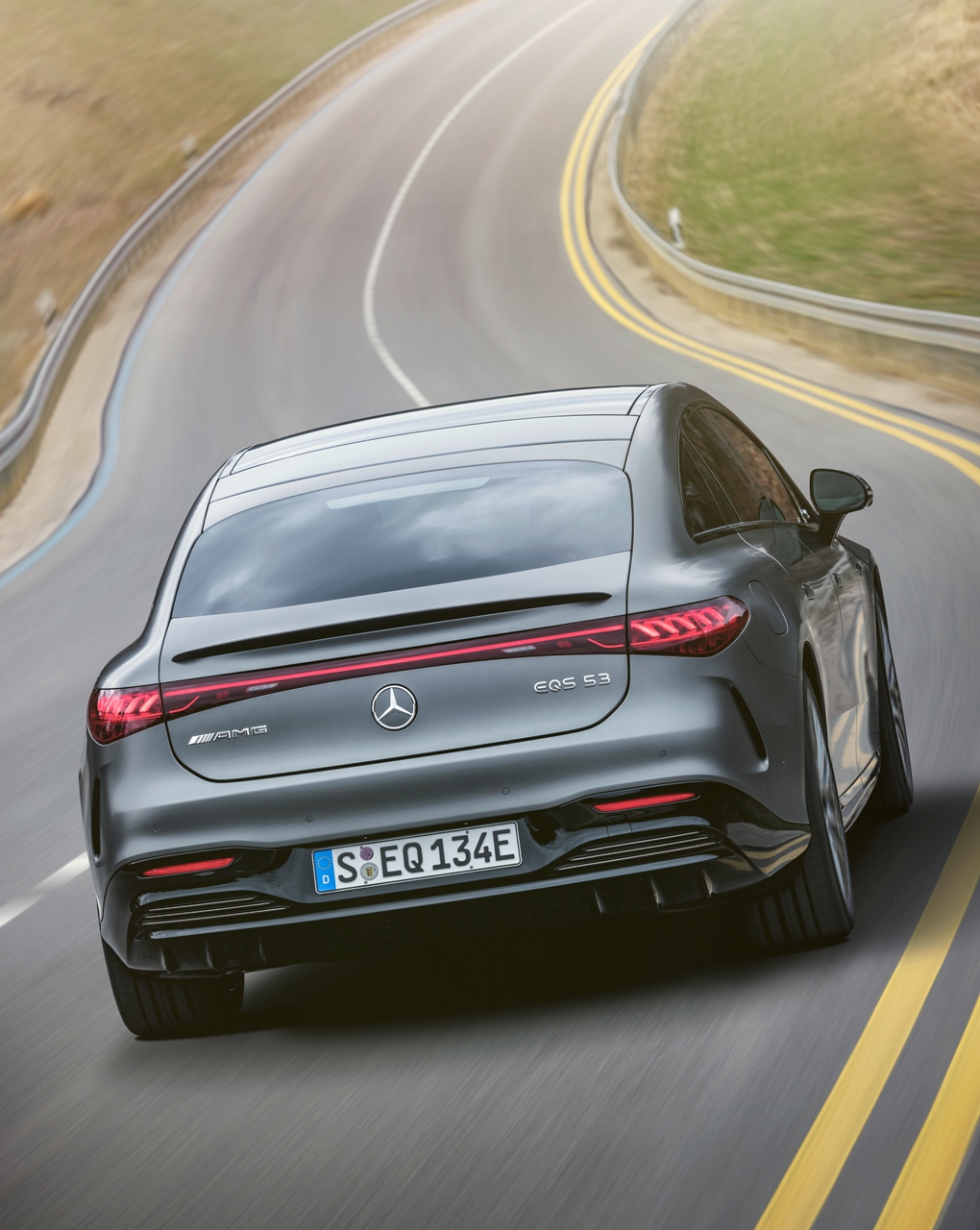 De serie, el nuevo Mercedes-AMG EQS 53 4MATIC+ está equipado con un eje direccional trasero que puede girar hasta 9 grados. Esto contribuye a mejorar su paso por curva y reducir su radio de giro. Una suspensión neumática adaptativa AMG RIDE CONTROL+ forma parte del equipamiento estándar y recibe una serie de ajustes específicos de AMG.