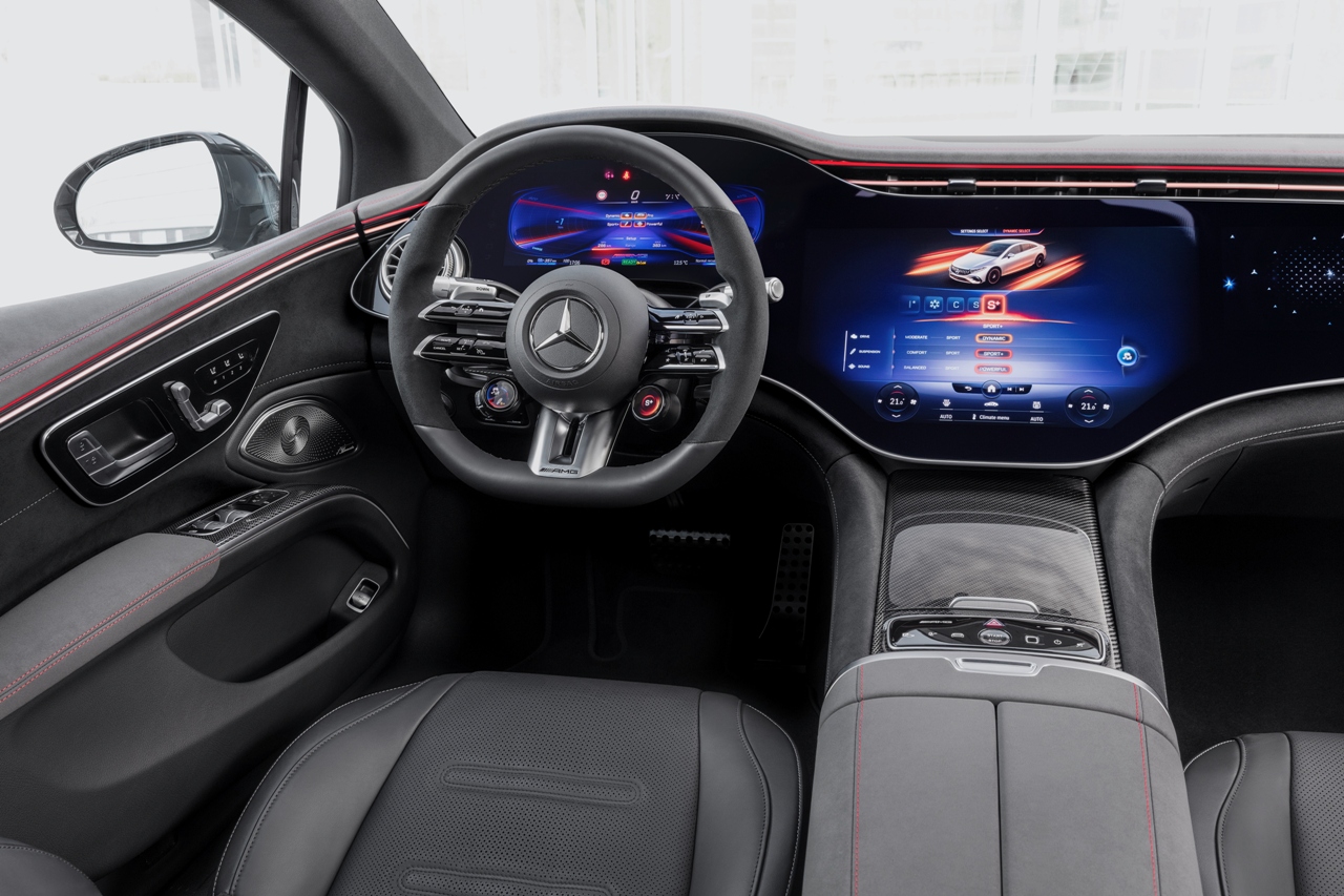 En lo que respecta al interior, el EQS 53 AMG cuenta con la famosa Hyperscreen de Mercedes y el sistema MBUX de infoentretenimiento, con funciones de telemetría en el paquete opcional AMG Track Pace. Encontramos toques deportivos en los asientos tapizados en símil de cuero Artico (cuero Napa opcional). También en el volante AMG Performance, levas de aluminio, costuras en rojo, pedales deportivos y alfombrillas AMG.