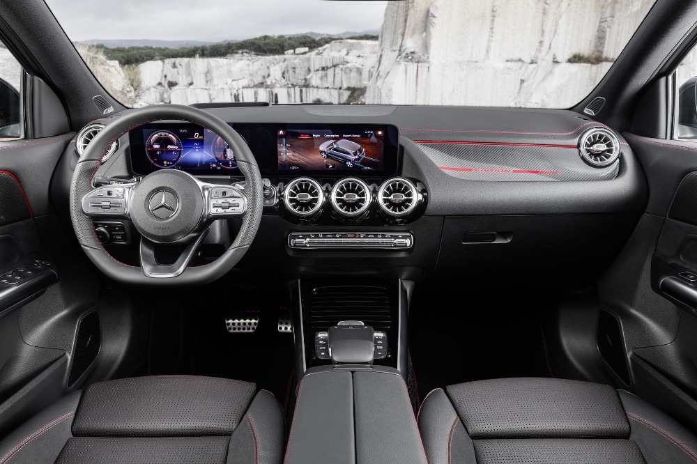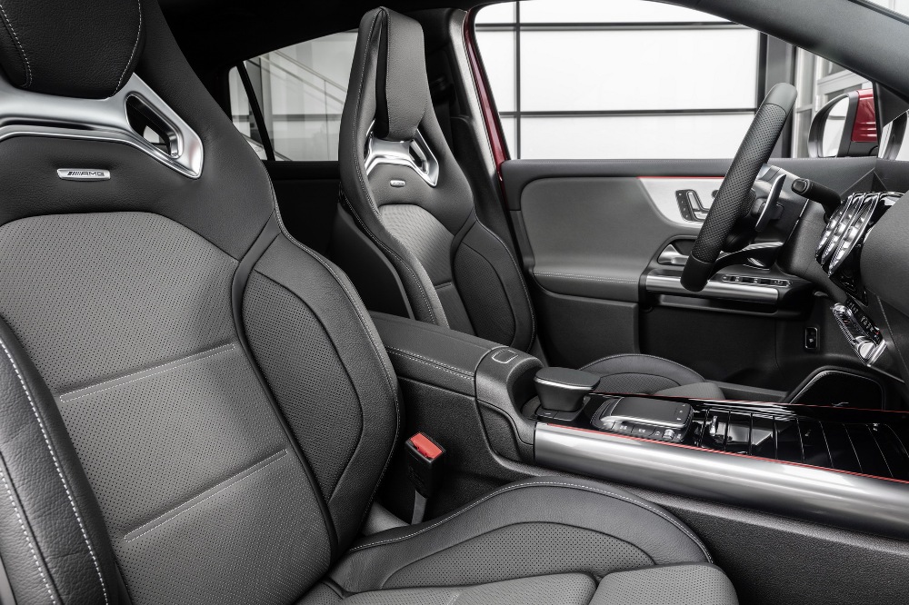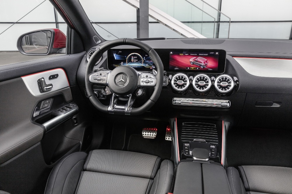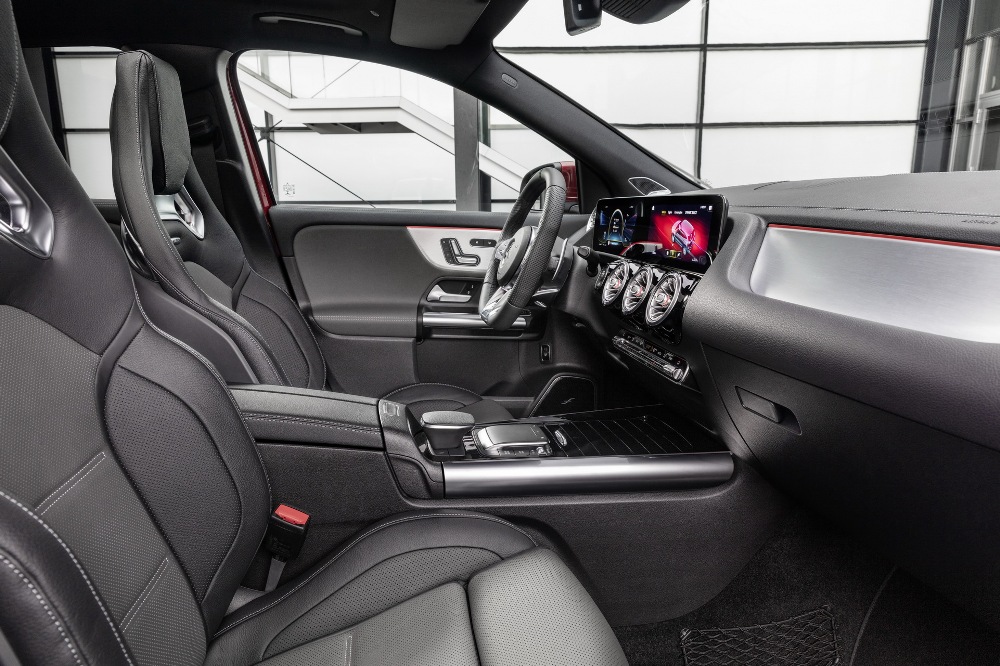 En el interior de la versión más potente (por ahora) del Mercedes GLA encontramos las dos pantallas de 10,25 pulgadas del sistema multimedia MBUX con detalles específicos AMG, acompañadas de los asientos deportivos de cuero y microfibra con pespuntes en rojo y cinturones de seguridad a juego, volante multifunción AMG en cuero Nappa, molduras de fibra de carbono, pedales de acero inoxidable y una serie de acentos en color rojo.