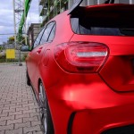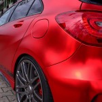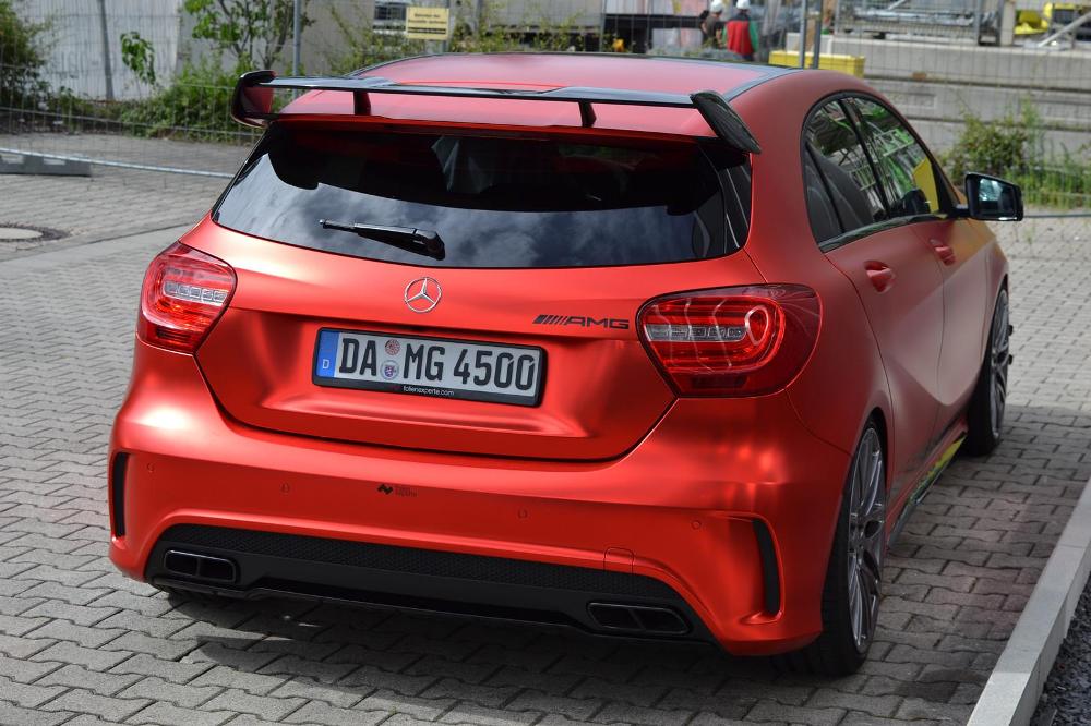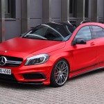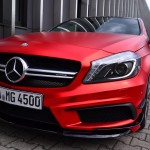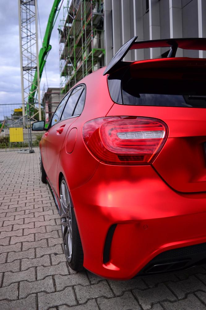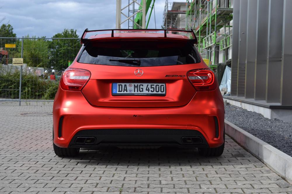 La pintura exterior, en color rojo original, ahora recibe un tratamiento completo para obtener el exclusivo efecto mate-cromado, una nueva envoltura por cortesía de los chicos de Folien Experte y disponible por 4.200 euros. Entre las mejoras estéticas que recibe el pequeño Mercedes-Benz A45 AMG, se encuentra la suspensión completa KW valorada en 3.000 euros y las llantas Brabus Monoblock F de 19 pulgadas cubiertas con neumáticos Pirelli P Zero, un conjunto que se vende por 4.500 euros.
