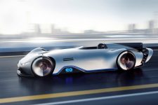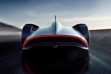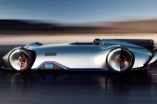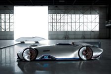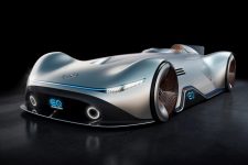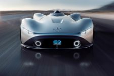 Terminado en un color llamado Alubeam Silver como las flechas plateadas, su enorme carrocería de 5,3 metros de longitud está fabricada en fibra de carbono ligera que mantiene el peso a raya. El frontal está protagonizado por una franja de luz que une ambos grupos ópticos, unos marcados pasos de rueda y un parachoques en fibra de carbono visible con otros dos faros integrados en la parrilla y el logotipo EQ de la recién creada submarca de vehículos eléctricos de Mercedes en el centro.