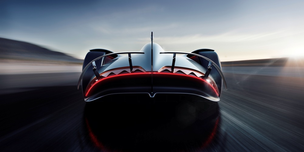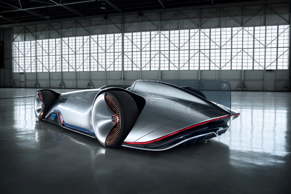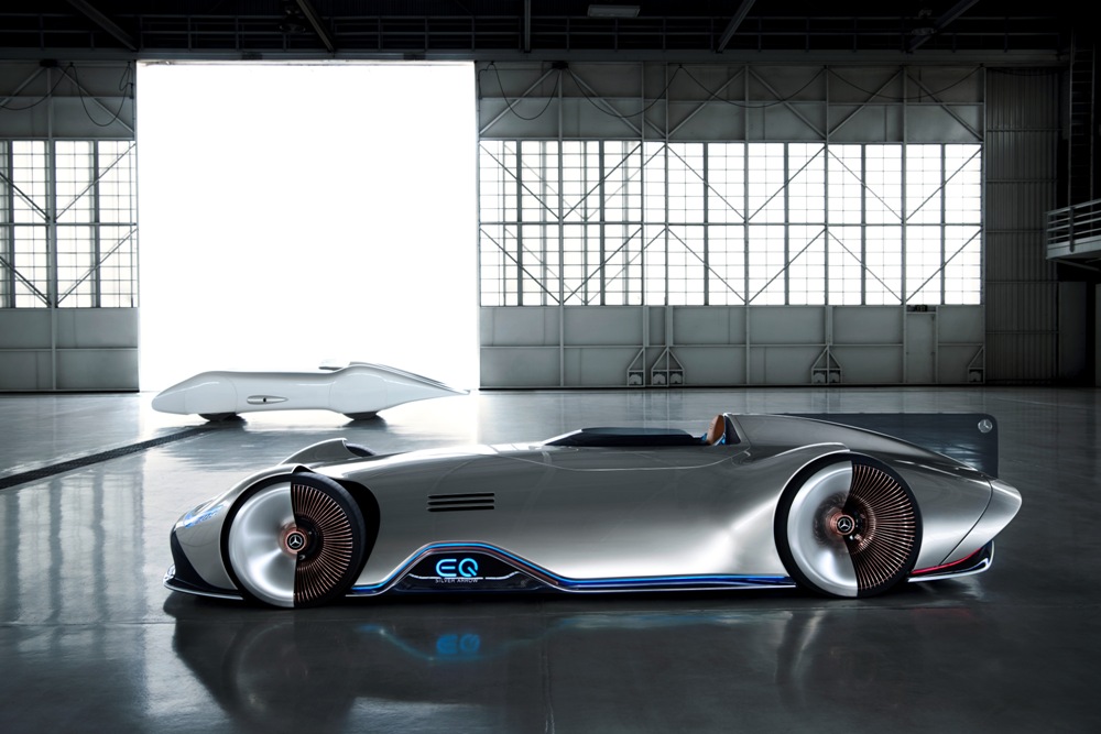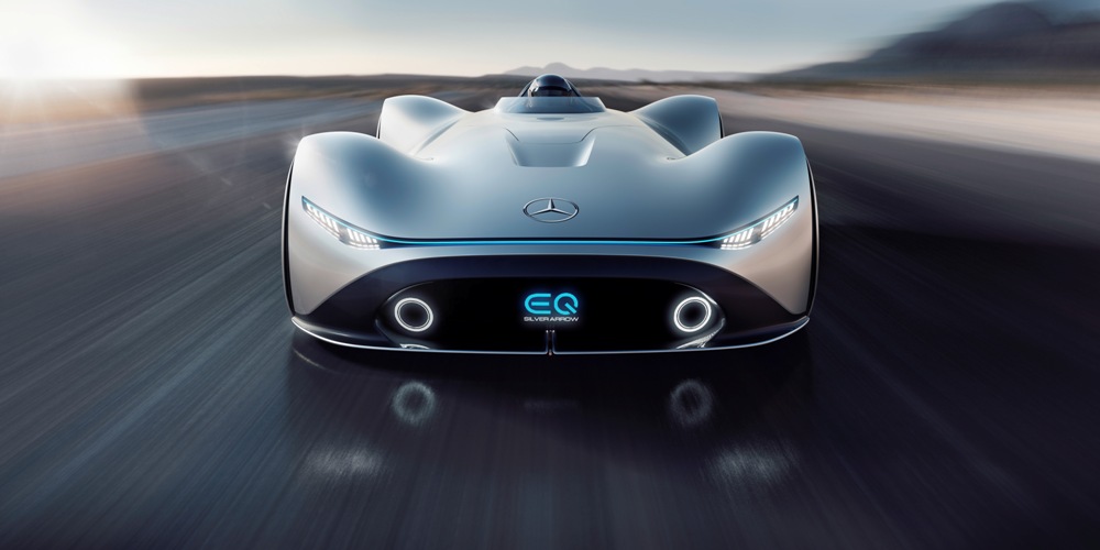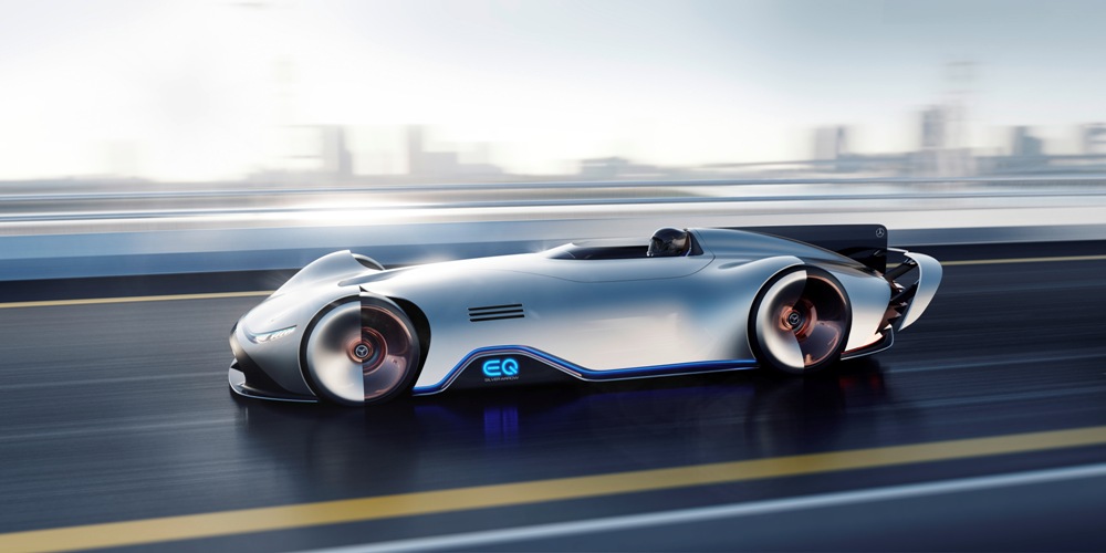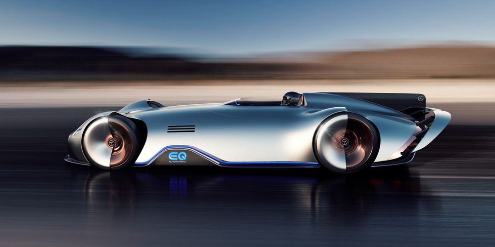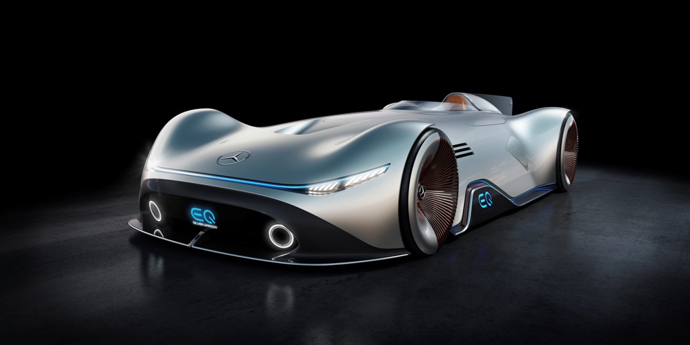 Terminado en un color llamado Alubeam Silver como las flechas plateadas, su enorme carrocería de 5,3 metros de longitud está fabricada en fibra de carbono ligera que mantiene el peso a raya. El frontal está protagonizado por una franja de luz que une ambos grupos ópticos, unos marcados pasos de rueda y un parachoques en fibra de carbono visible con otros dos faros integrados en la parrilla y el logotipo EQ de la recién creada submarca de vehículos eléctricos de Mercedes en el centro.