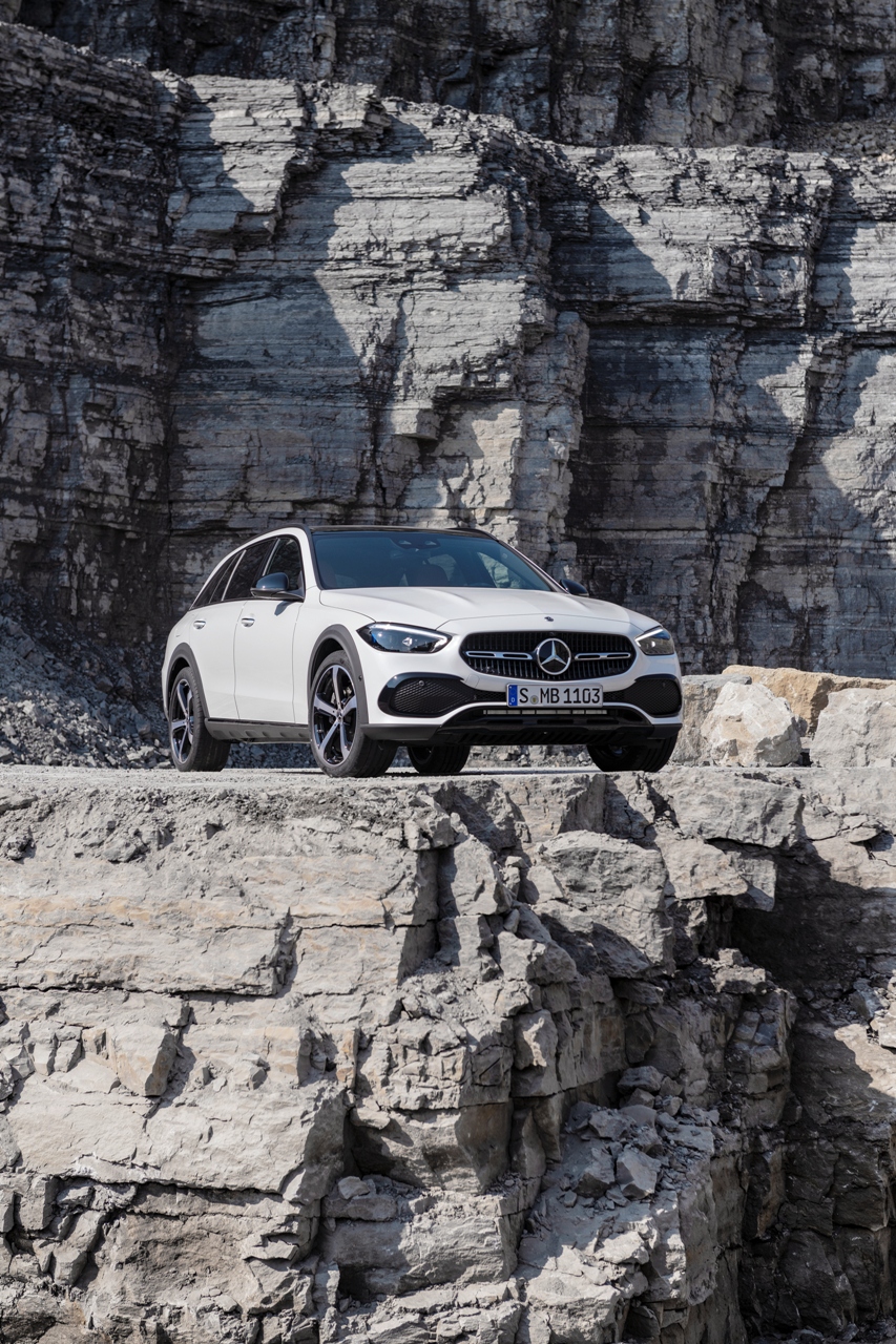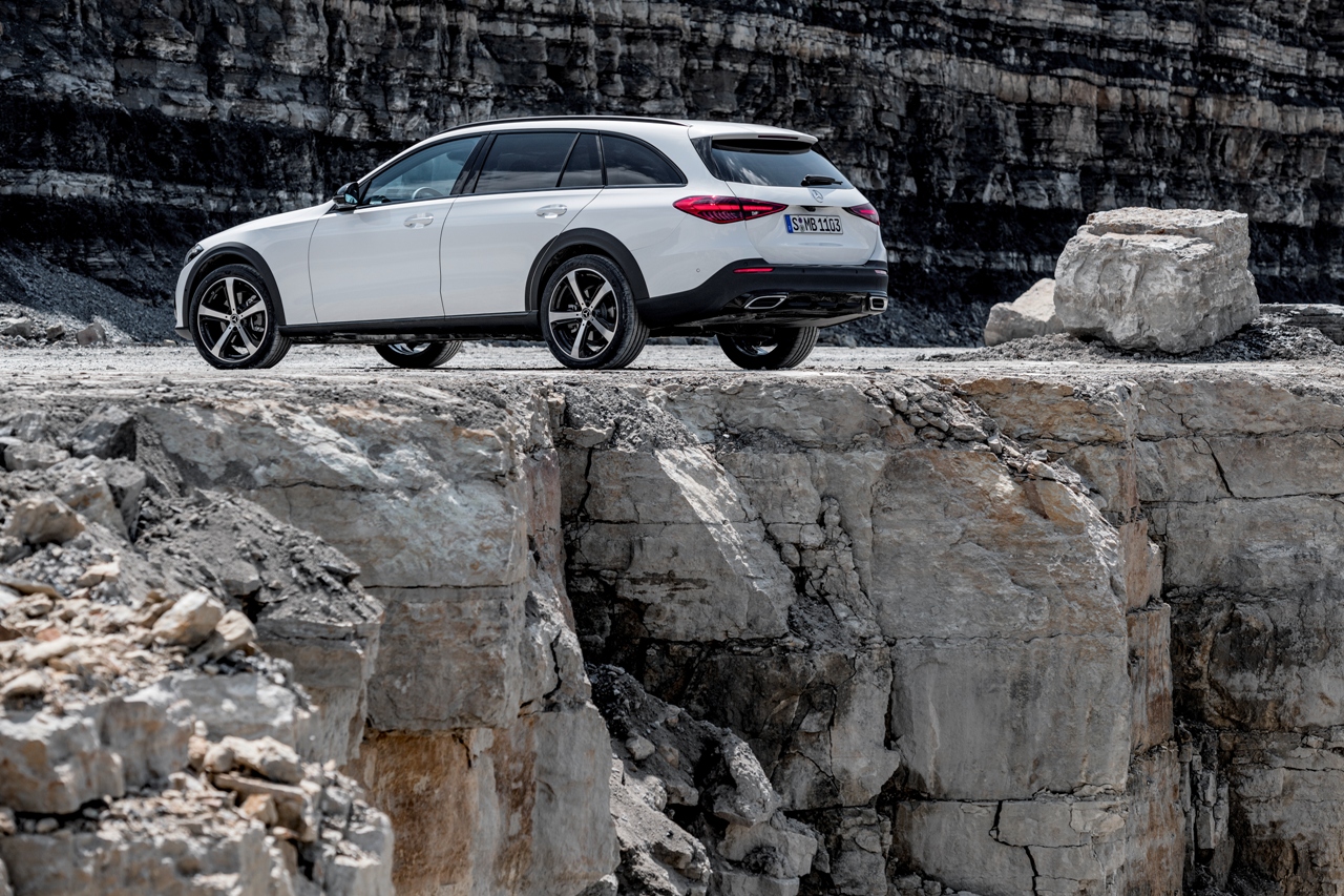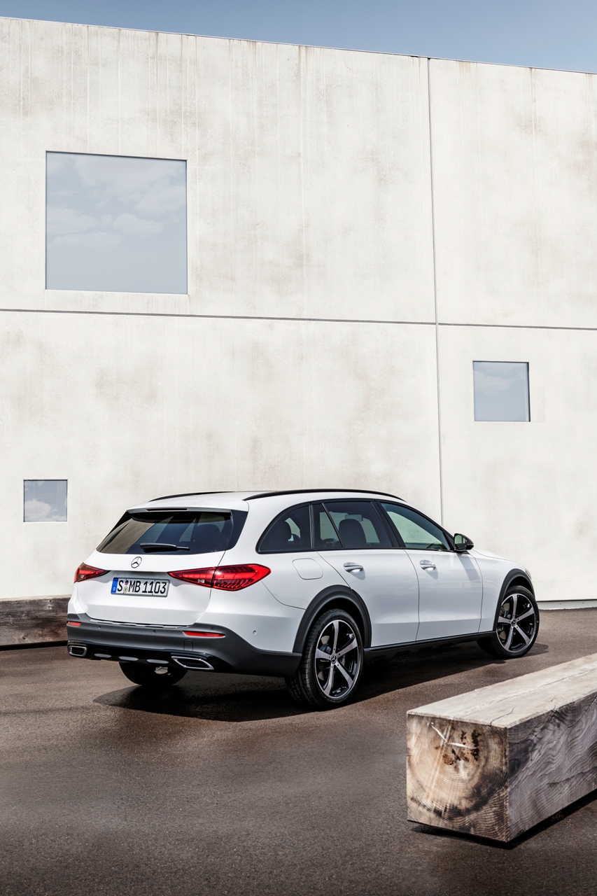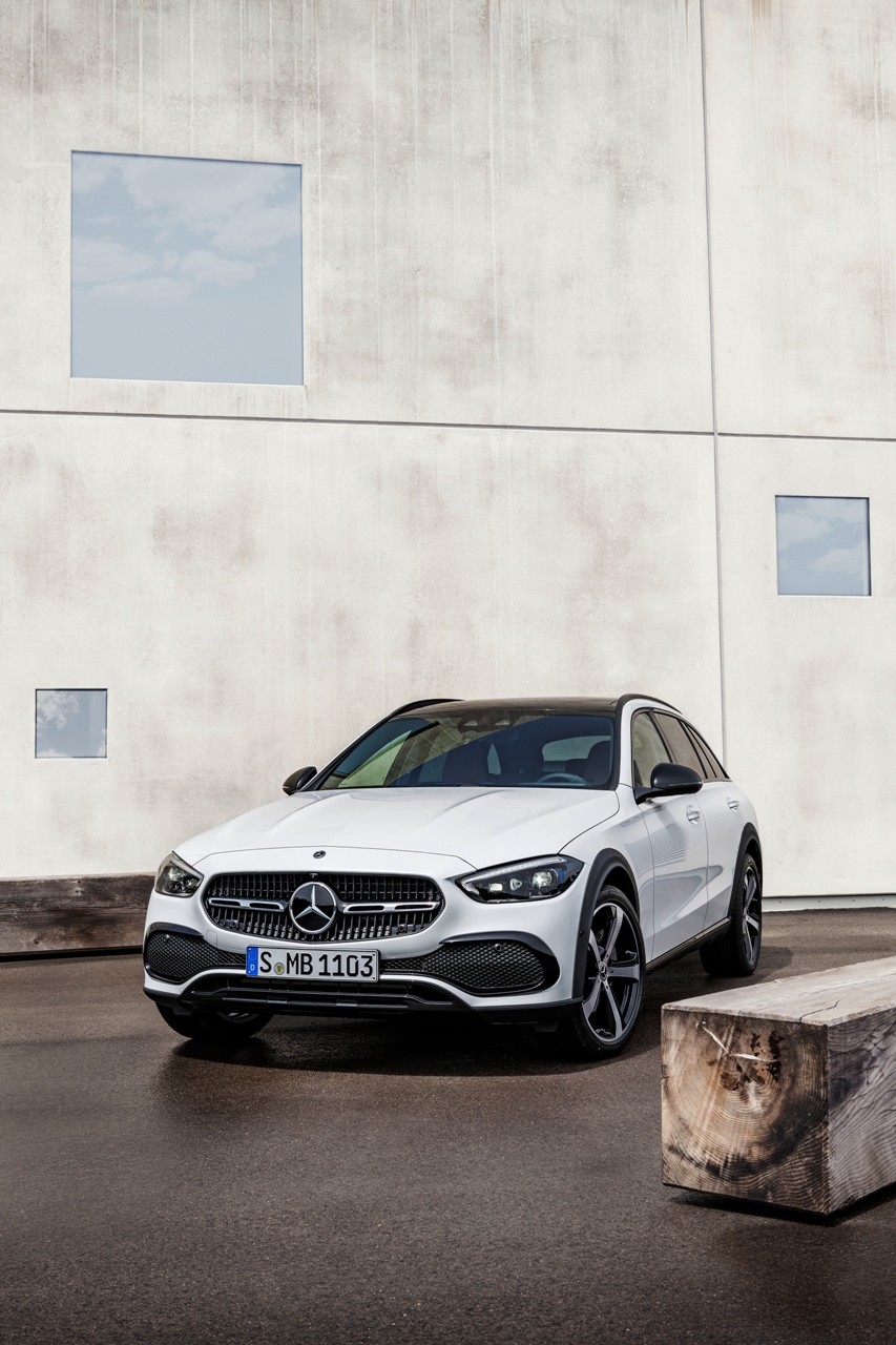 Basado en la carrocería Estate del nuevo Clase C, la versión All-Terrain presenta una parrilla con una sola lama horizontal y perfiles en negro brillante. El parachoques delantero incluye una parte de plástico de color gris oscuro con superficie estructurada y una protección estética de bajos en color cromo. También se ha equipado revestimientos superpuestos de los pasaruedas de color gris oscuro mate en los guardabarros y la pared lateral trasera.