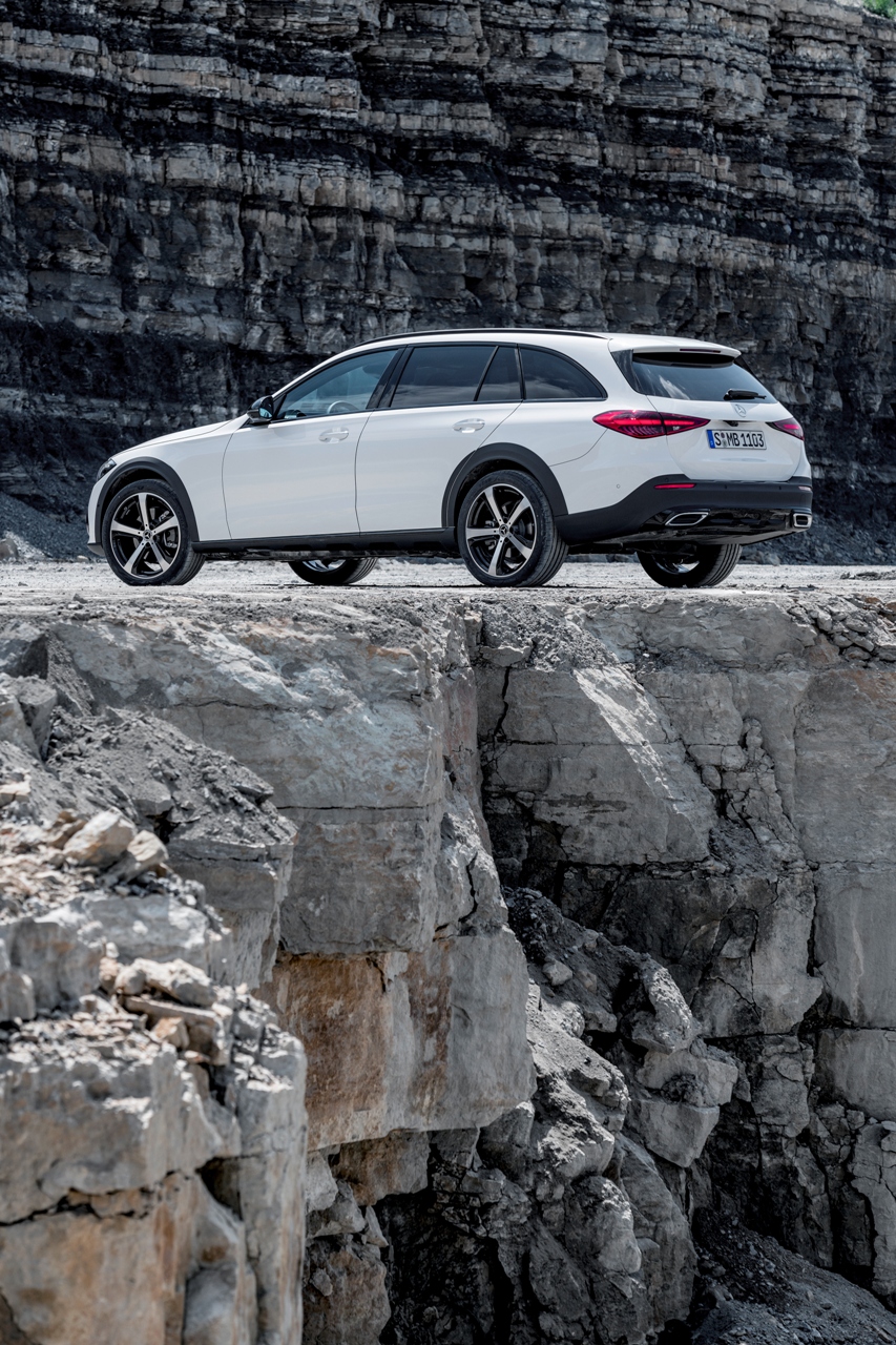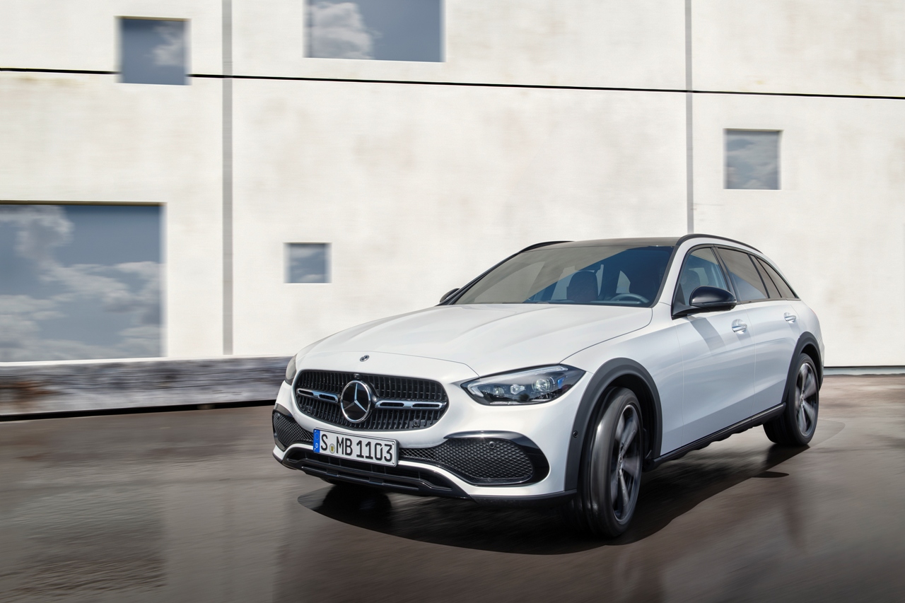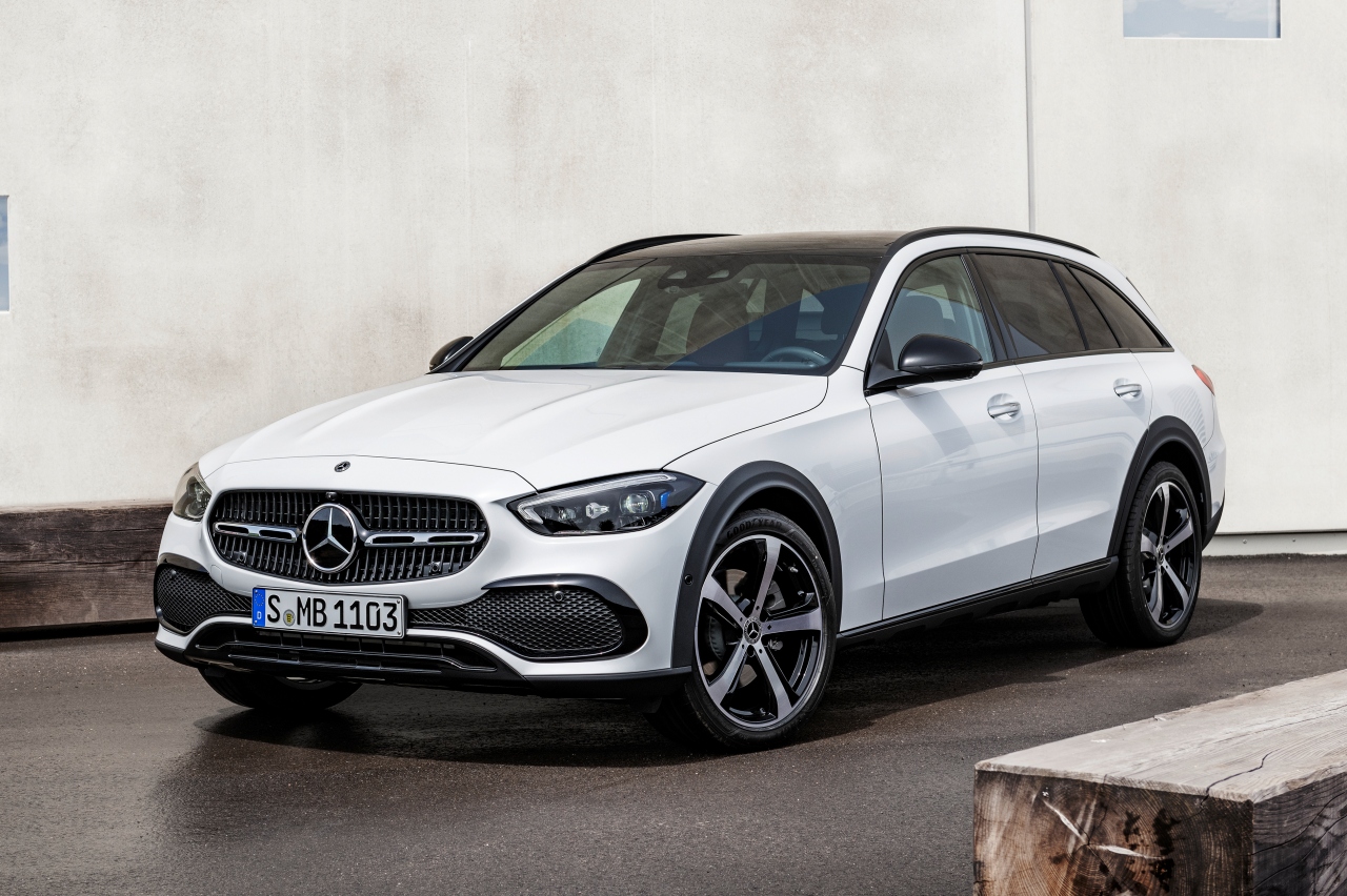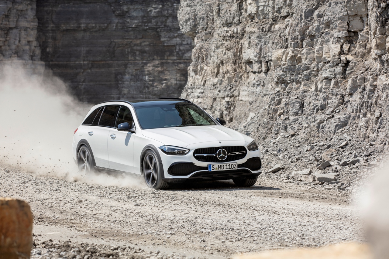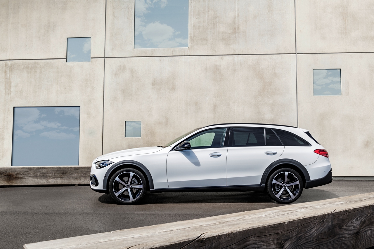 Basado en la carrocería Estate del nuevo Clase C, la versión All-Terrain presenta una parrilla con una sola lama horizontal y perfiles en negro brillante. El parachoques delantero incluye una parte de plástico de color gris oscuro con superficie estructurada y una protección estética de bajos en color cromo. También se ha equipado revestimientos superpuestos de los pasaruedas de color gris oscuro mate en los guardabarros y la pared lateral trasera.