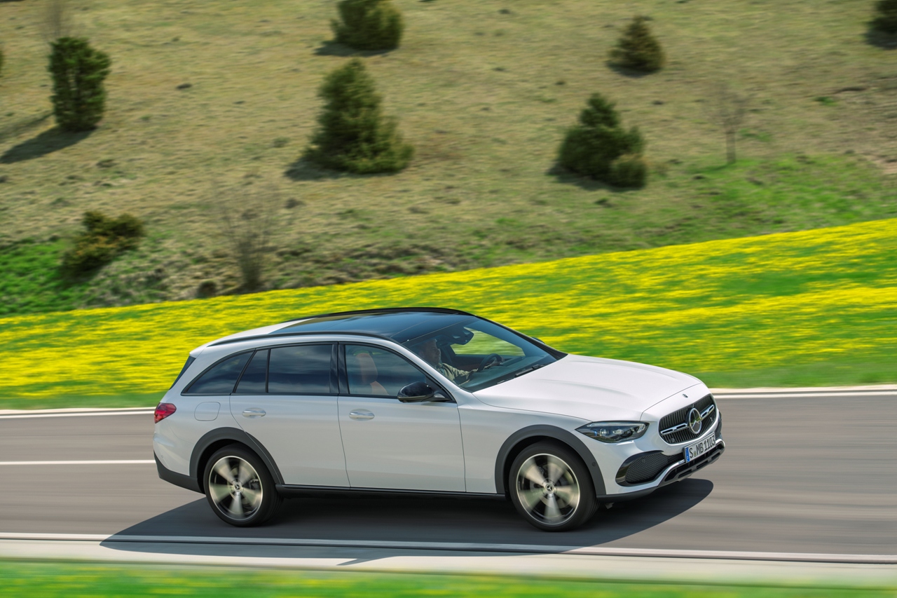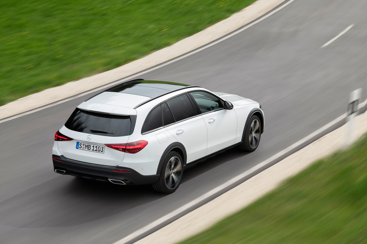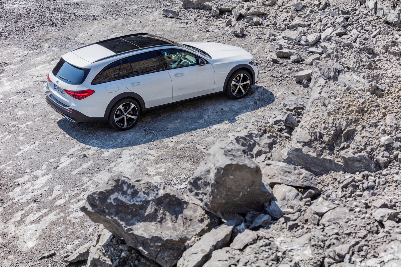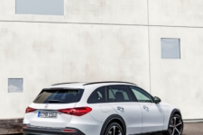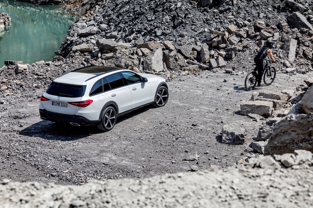Basado en la carrocería Estate del nuevo Clase C, la versión All-Terrain presenta una parrilla con una sola lama horizontal y perfiles en negro brillante. El parachoques delantero incluye una parte de plástico de color gris oscuro con superficie estructurada y una protección estética de bajos en color cromo. También se ha equipado revestimientos superpuestos de los pasaruedas de color gris oscuro mate en los guardabarros y la pared lateral trasera.