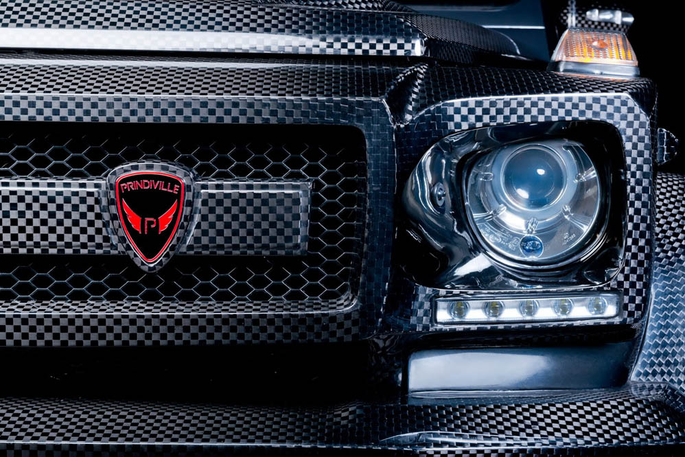 El preparador Prindiville ha escogido el Mercedes Clase G, en concreto la versión más radical de la gama, el G63 AMG, para llevar a cabo su nuevo trabajo. Gracias a las nuevas modificaciones, el 4x4 de la estrella muestra un aspecto mucho más agresivo. Para conseguirlo, la compañía ha diseñado un kit de carrocería formado nada menos que por 30 piezas fabricadas de manera artesanal. La fibra de carbono es el 'ingrediente' básico de todas, tal y como se aprecia en la gran mayoría de sus elementos: parachoques, faros, parrilla, faldones, tiradores de las puertas, espejos retrovisores, cubierta de la rueda de repuesto... Asimismo, la carrocería se puede pedir en negro o mate.