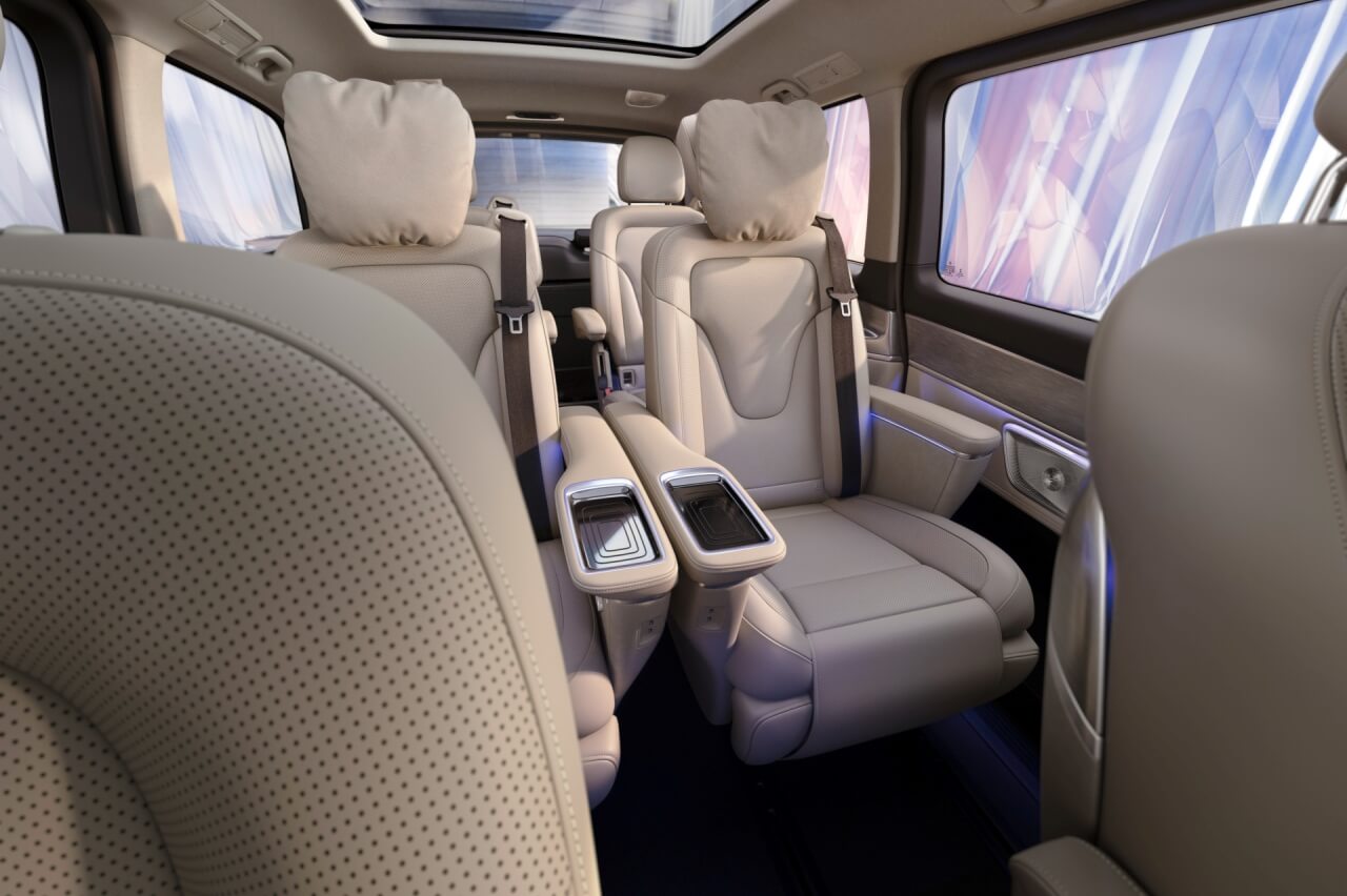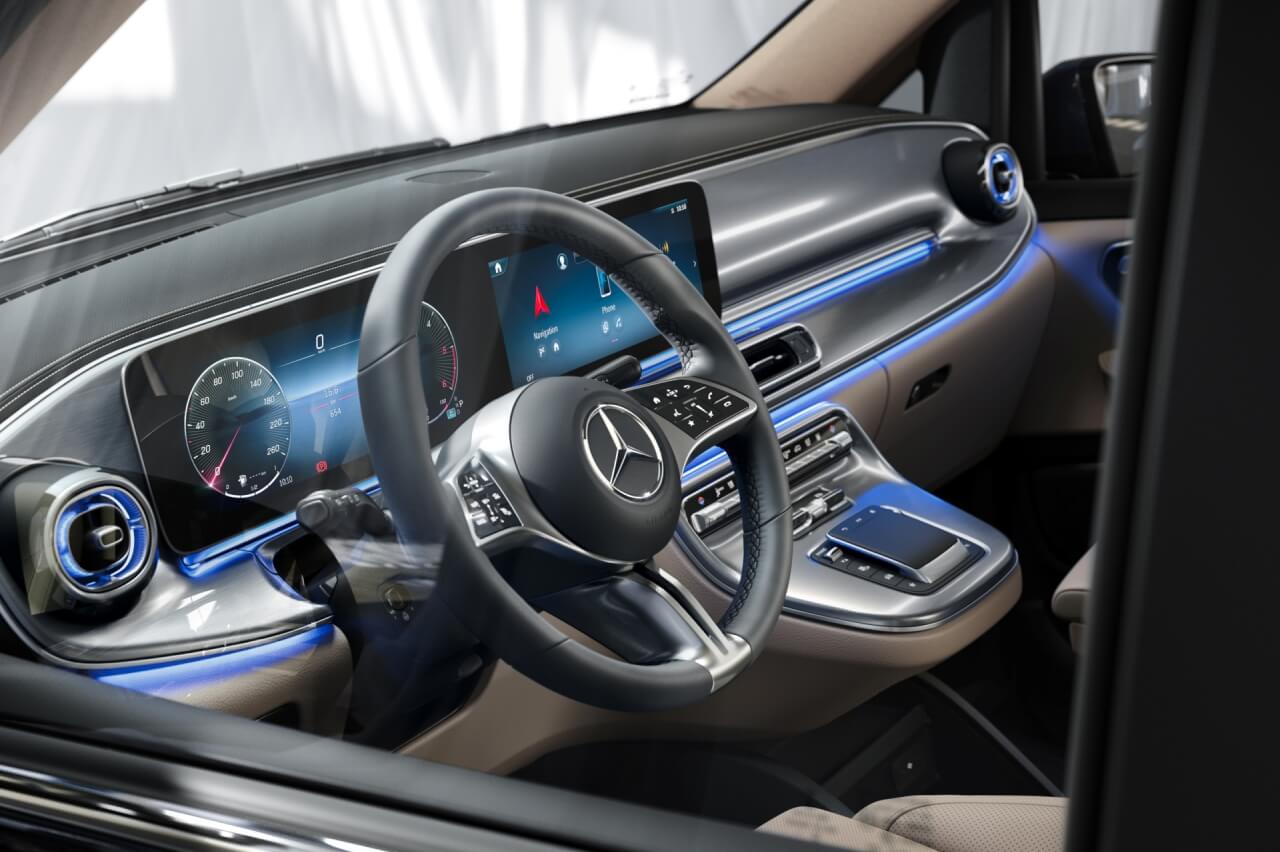 Los modelos eléctricos EQV y eVito admiten pre-acondicionamiento de la cabina y navegación inteligente con planificación de rutas y opciones de carga. También se han añadido nuevas opciones de seguridad y asistencia a la conducción, como el asistente de mantenimiento de carril activo, el asistente inteligente de velocidad y control de ángulo muerto. Mientras, el sistema Distronic es parte del equipamiento de serie el Clase V y el EQV, y opcional en el Vito.