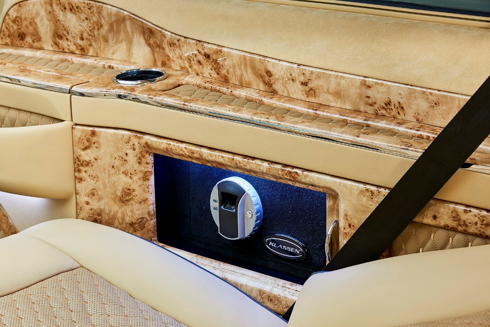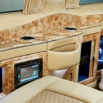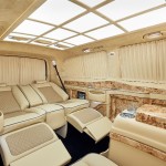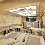 Una enorme pantalla de televisión trabaja como sistema de infoentretenimiento y se sitúa en la sección que divide la cabina del resto del interior. Se controla mediante unos mandos integrados en la tercera fila de asientos, mientras que los últimos detalles son un mueble bar, mesa plegables, conexiones de 12V e incluso una caja fuerte con lector de huellas dactilares.