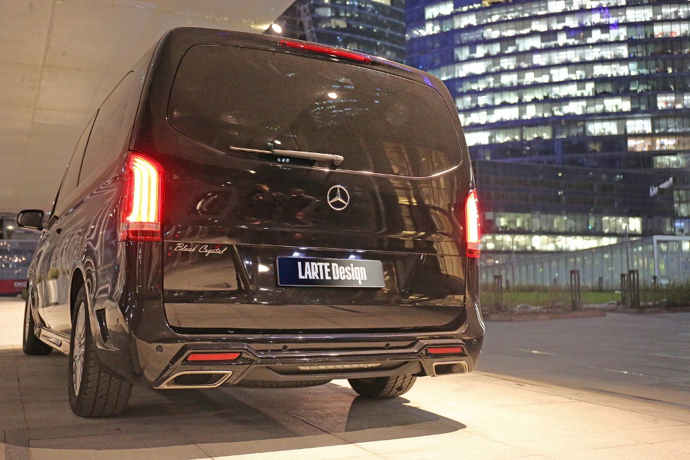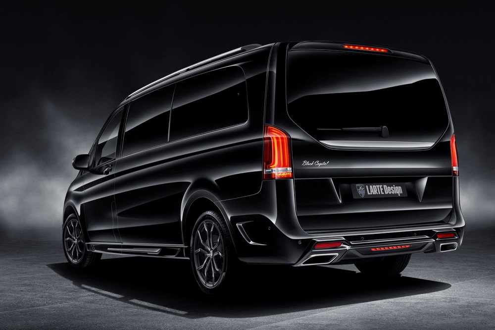 Para ello han creado el Mercedes Clase V Larte Design, el cual recibe la denominación 'Black Crystal'. La preparación adopta como base la variante del Clase V con mayor distancia entre ejes para tener un mayor espacio interior. El exterior, por su parte, recibe una acabado en negro brillante con parachoques hechos a base de materiales compuestos y decorados con elementos de fibra de carbono, teniendo como detalle los dos cristales de Swarovski integrados en el parachoques delantero y del que hereda la denominación.