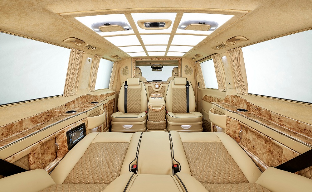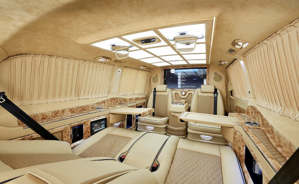 Para Larte Design, el Clase V es la alternativa al Mercedes Clase S. El interior está hecho a medida, con cuatro aseitnos enfrentados en la parte posterior, dos de ellos reclinables, acabados de primera calidad como madera y cuero que reviste tanto los asientos como los laterales, mientras que los plilares y el techo reciben un acabado del mismo color. El techo cuenta con paneles de iluminación, y las ventanas cortinillas para mantener la privacidad.