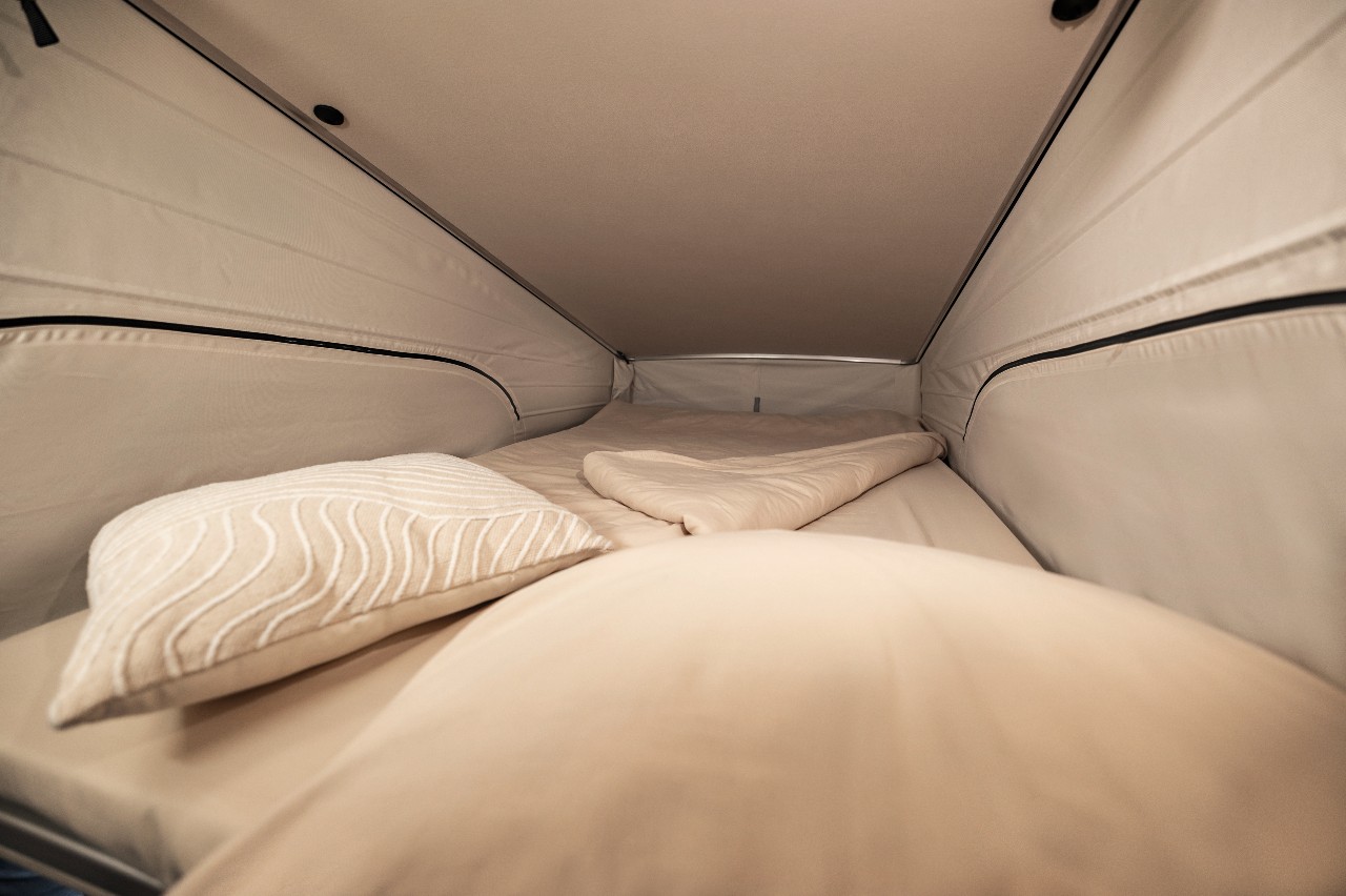 La nueva generación de la Marco Polo conserva el concepto de habitabilidad que siempre ha caracterizado al modelo. Ofrece espacio para hasta cuatro personas y viene equipada de serie, entre otras cosas, con un techo desplegable con cama de techo, una combinación de asiento y litera, una mesa plegable, una cocina totalmente equipada y un armario ropero.