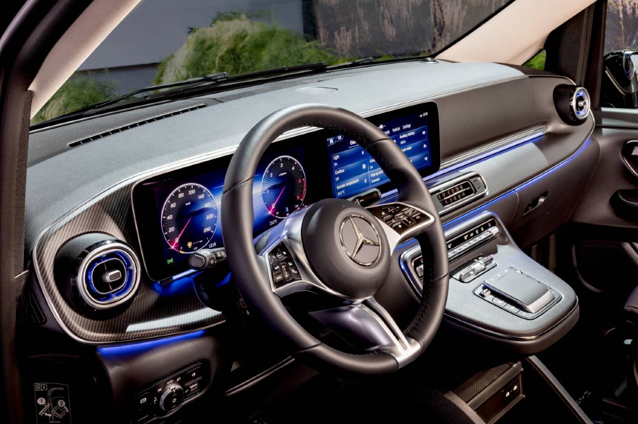Entre el equipamiento que puede ofrecer la camper de Mercedes, destaca la calefacción del volante opcional y la iluminación trasera atenuada para conducir de noche. La iluminación ambiental, que ahora también se puede encontrar en la puerta corredera trasera, ofrece un ambiente aún más individual con 64 nuevos colores.