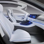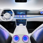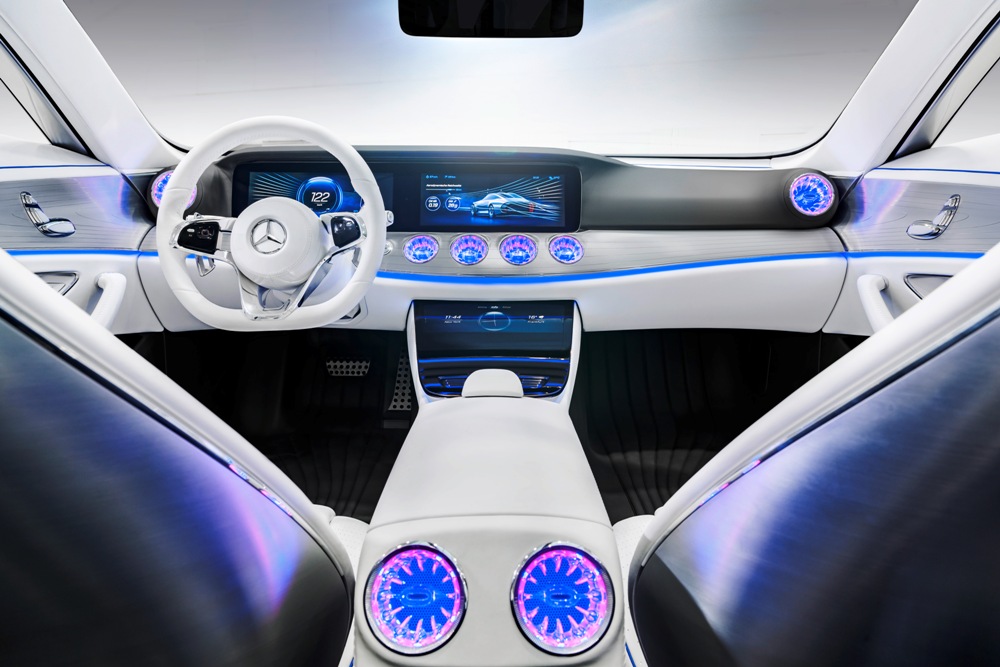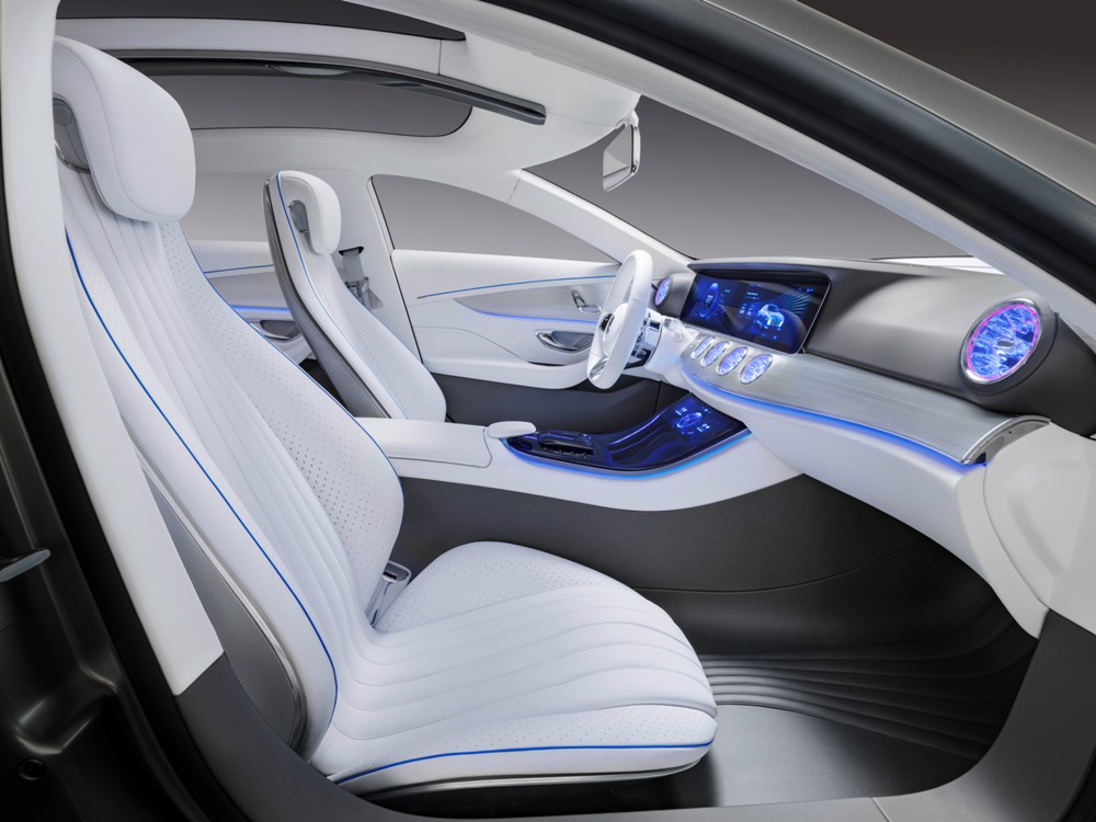 Una vez en el habitáculo del Mercedes Concept IAA, el fabricante con sede en Stuttgart ha llevado un paso más allá el diseño del Mercedes Clase S y Clase S Coupé, con un sistema de infoentretenimiento táctil, una pantalla para el panel de instrumentos y el navegador, así como materiales y cuero de alta calidad, con inserciones en aluminio y cristal tallado. El volante de dos radios incorpora funcionalidades táctiles como el Optical Finger Navigation, para controlar todas las funciones del navegador.
