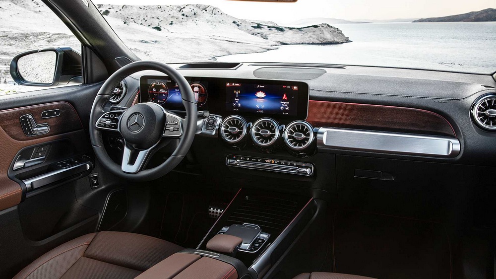 El habitáculo del nuevo Mercedes GLB presenta un aspecto lujoso y tecnológico gracias, por ejemplo, a un cuadro de mandos totalmente digital y a la pantalla del sistema multimedia que se sitúa junto a él. Cuenta con multitud de elementos con un remate con efecto de aluminio mecanizado, con el galardonado sistema MBUX y, en función del equipamiento, puede disponer de elementos como un Head-Up Display a color.