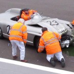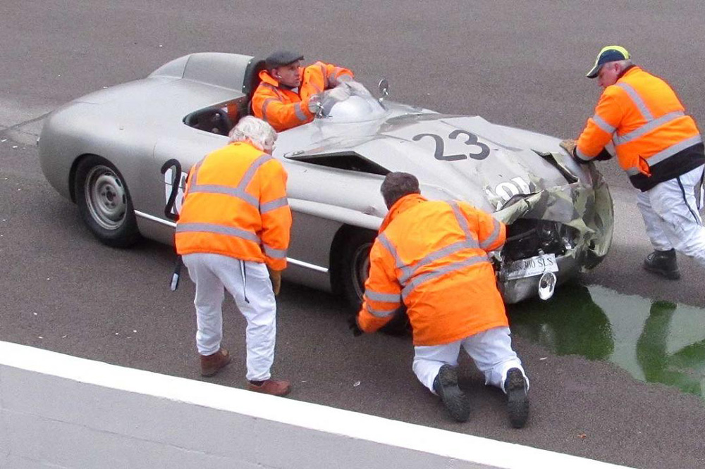 El 300SLS Porter Special sufrió importantes daños en el frontal y quedó totalmente inmovilizado en mitad de la pista. Lo conducía Hans Stuck, el legendario piloto alemán, y según nos informan desde WolrdCarFans, se trataba de una unidad proveniente del mismísimo museo de Mercedes-Benz. Tienes las imágenes a continuación, pero si quieres ver más instantáneas del doloroso momento, puedes pinchar en la fuente que encontrarás tras las imágenes.