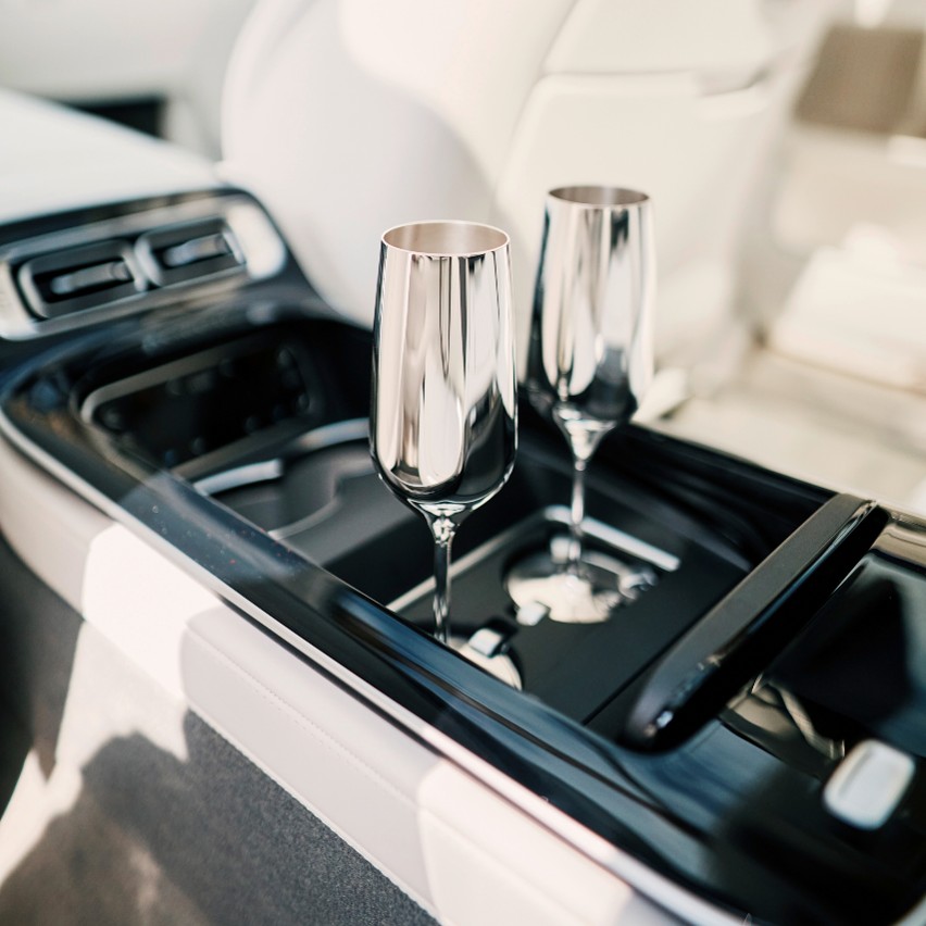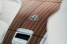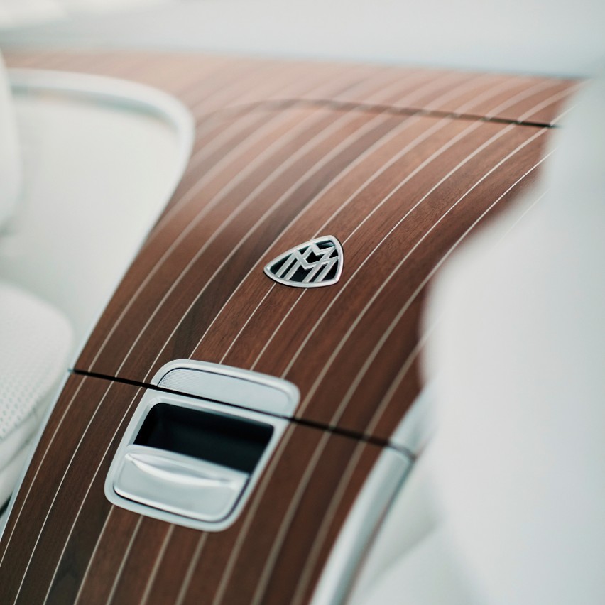 Por supuesto, hay una abundante presencia de paneles de madera de nogal, especialmente seleccionadas para imitar la cubierta de un barco, con embellecedores de aluminio que aportan un toque extra de exclusividad. Los asientos cuentan con un tapizado en piel Nappa Crystal White a juego con un generoso acolchado en forma de diamante. Al abrir las puertas, los umbrales están decorados con el nombre ‘Maybach’.