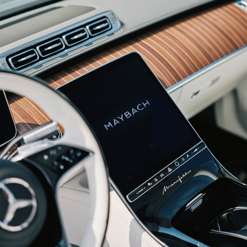 Los asientos, el revestimiento del techo, los paneles de las puertas e incluso el compartimento portaobjetos están forrados en napa Maybach Manufaktur Exclusive en Crystal White, con una trama en forma de rombos. Las costuras en Gris Orión añaden un toque distinguido.