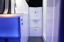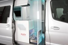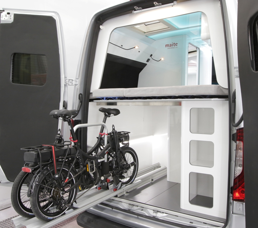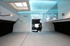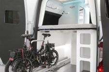 Las puertas posteriores dan acceso a una bodega de gran capacidad en la que se ha instalado un carril eléctrico que facilita la carga y descarga con gran comodidad de hasta dos bicicletas. Por otro lado, los ocupantes tienen acceso total al control de las funciones más importantes del vehículo a través del teléfono móvil, como son la iluminación, sonido, climatización, niveles, energía y seguridad.
