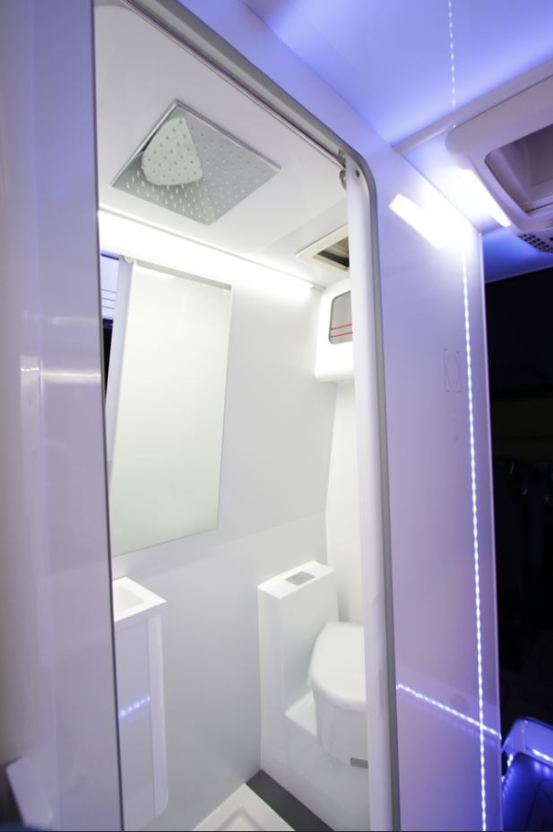 El acceso lateral abre paso a un interior moderno con superficies limpias de aspecto minimalista. Encontramos una cocina con vitrocerámica, un fregadero, lavavajillas integrado, diferentes compartimentos de almacenaje, una mesa, una televisión y un equipo de sonido. También se ha integrado una cama fija XL con respaldo abatible y completo cuarto de baño con ducha independiente.