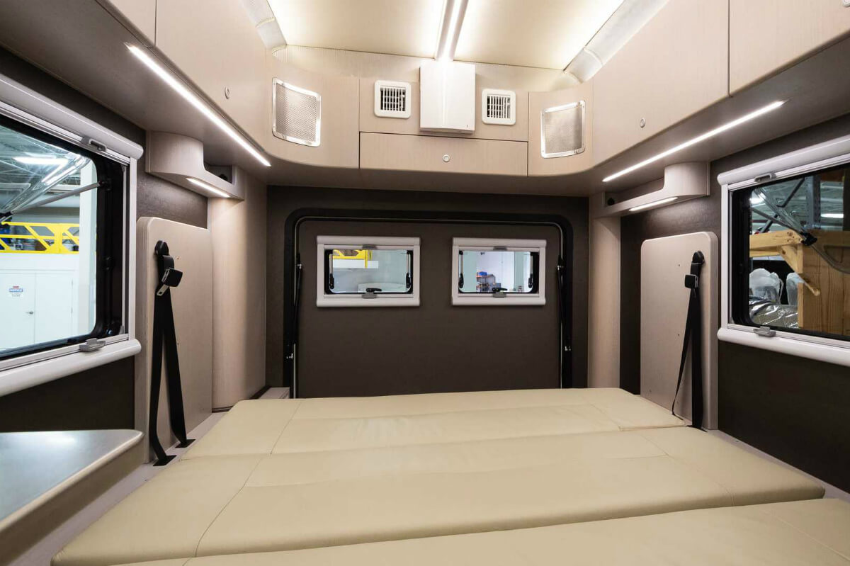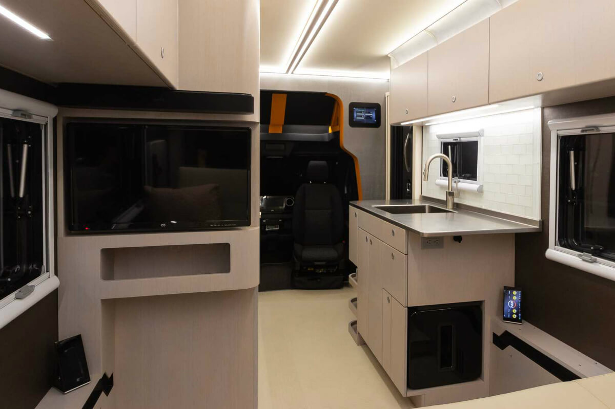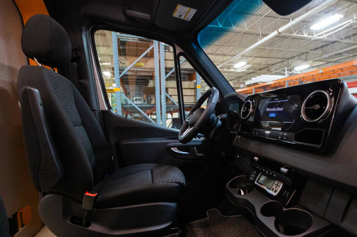 Aunque no lo parezca, las dimensiones exteriores coinciden exactamente con las de una Sprinter tradicional, pero en el interior hay 22,8 centímetros adicionales de ancho y el techo mide 2,03 metros de alto. Cuenta con un sistema de climatización y calefacción por suelo radiante para sus pasajeros.
