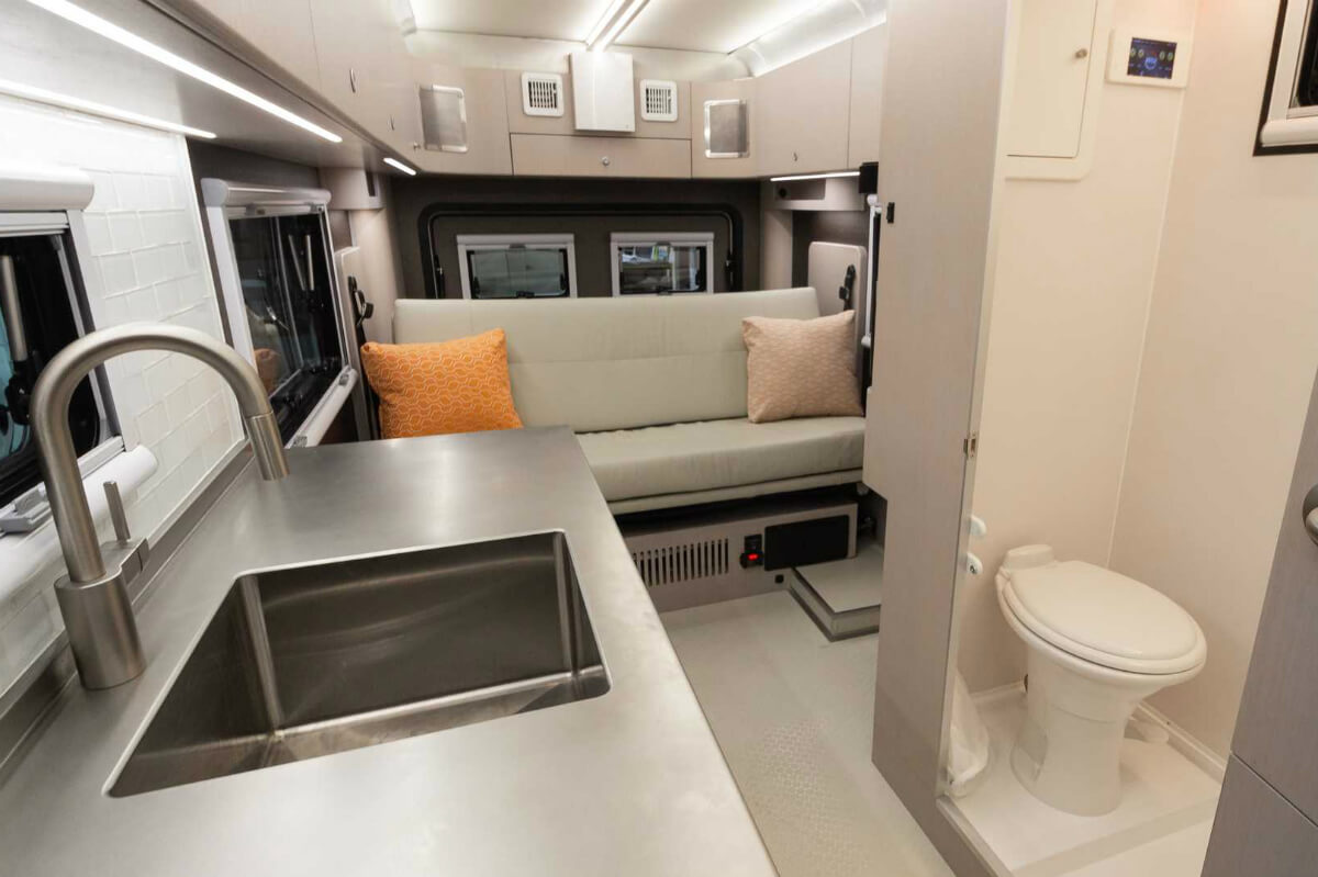 Éstos podrán disfrutar de todas las comodidades de una autocaravana: un salón-comedor que se transforma en zona de descanso, una cocina completa y un baño con ducha y agua caliente. La B Box ha sido equipada con un tanque de 190 litros de agua y dos más de 105 litros cada uno para las aguas grises; además, cuenta con un sistema de reciclaje que limpia y desinfecta el agua de la ducha para reutilizarla tanto para el baño como para el inodoro.