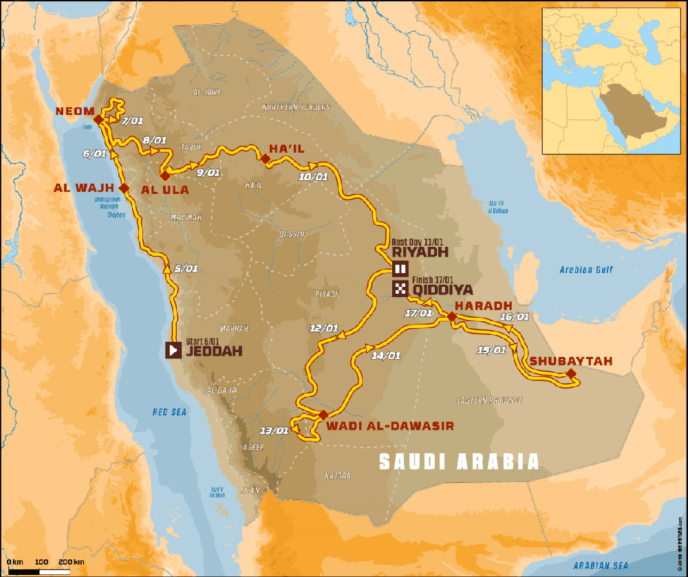 El recorrido está compuesto por un itinerario de 7.500 kilómetros de los cuales, unos 5.000 son especiales. De las 12 etapas del rallye, siete contarán con especiales de más de 400 kilómetros con dos jornadas en la que sobrepasarán los 500 km. Y todo esto en un entorno nuevo para la pareja española (y para la mayor parte de equipos), que durante la rueda de prensa celebrada en la sede BMW y MINI en España, aseguró que “la gran duda que tenemos es lo que nos vamos a encontrar. La primera semana de carrera tiene unas características más de caminos y piedras, tipo Marruecos. La segunda semana es un terreno más de arena, de dunas”.