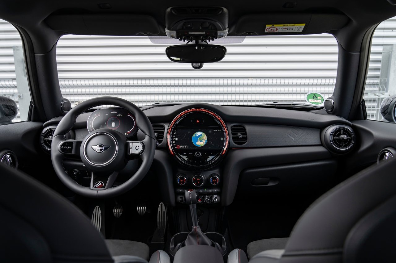 En el interior, la instrumentación central típica de Mini retoma el diseño con el bisel rojo brillante que, junto con la iluminación ambiental roja, contrasta con el revestimiento antracita del techo. La inscripción con el nombre exclusivo del modelo aparece en varias zonas del habitáculo, como los umbrales de las puertas, el radio inferior del volante forrado en napa y las alfombrillas. Además, a la izquierda el volante se ubica una pequeña placa con la inscripción ‘One of 999’, haciendo referencia a la edición limitada.