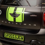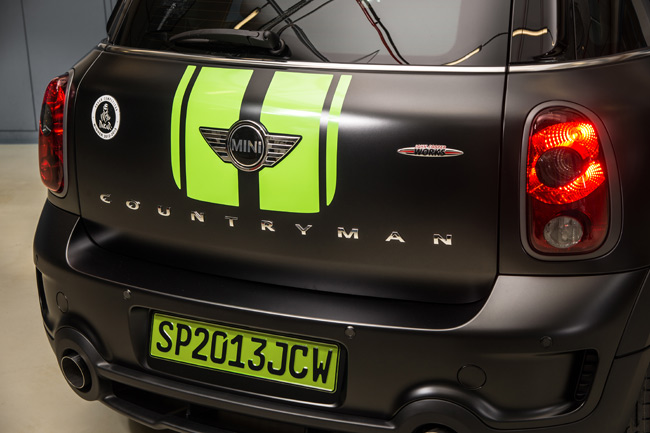 Podrás diferenciar al MINI John Cooper Works Countryman ALL4 Dakar Winner 2013 por su pintura negra mate, que incluye rasgos de diseño de color verde brillante -inspirados en los llamativos colores del victorioso MINI ALL4 Racing-; entre ellos, las franjas deportivas sobre el capó, en las que aparece el logotipo del Rallye Dakar y la firma del piloto ganador Peterhansel. Además de las franjas de color verde con la inscripción «MINI ALL4», en ambas puertas aparece el número 302 con el que corrió el coche ganador, así como los nombres del dúo victorioso.