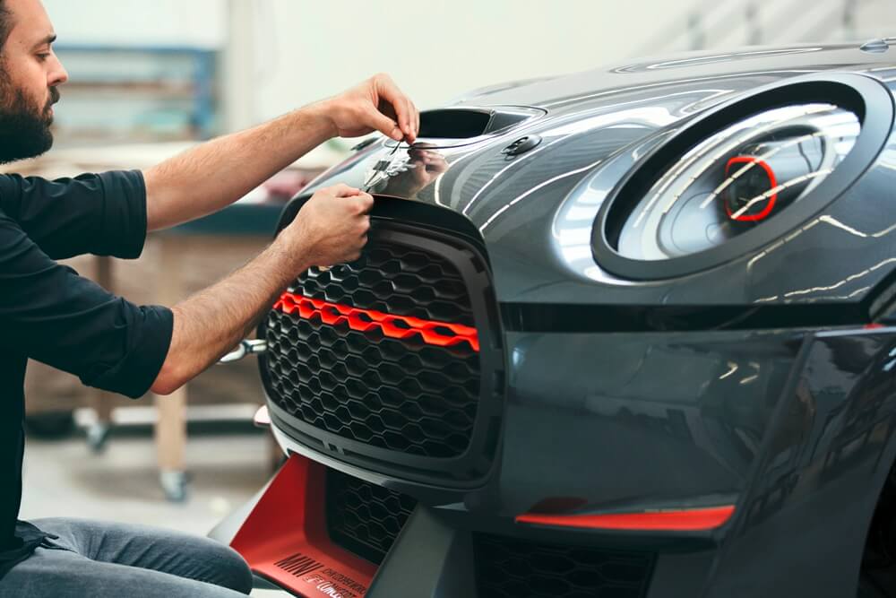 Empezando por su diseño frontal, el John Cooper Works GP Concept recoge todo lo que los anteriores GP dejaron y presenta un splitter enorme, una parrilla de panal, así como entradas de aire y deflectores en fibra de carbono. Unas taloneras laterales del mismo material, aletas delanteras y raseras más anchas para dar cabida a deflectores de aire, una entrada de aire sobre el techo, y una zaga donde cobra protagonismo un aerodinámico alerón, un difusor con salidas de escape centrales y un grupo óptico de LED dibujando la bandera Union Jack, como en el MINI Electric Concept.