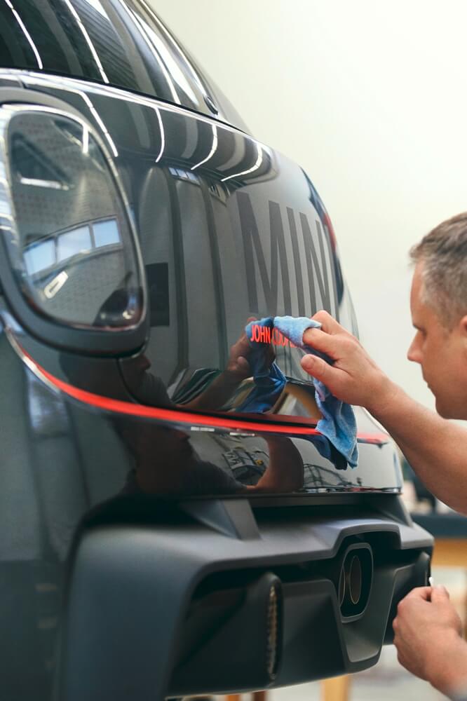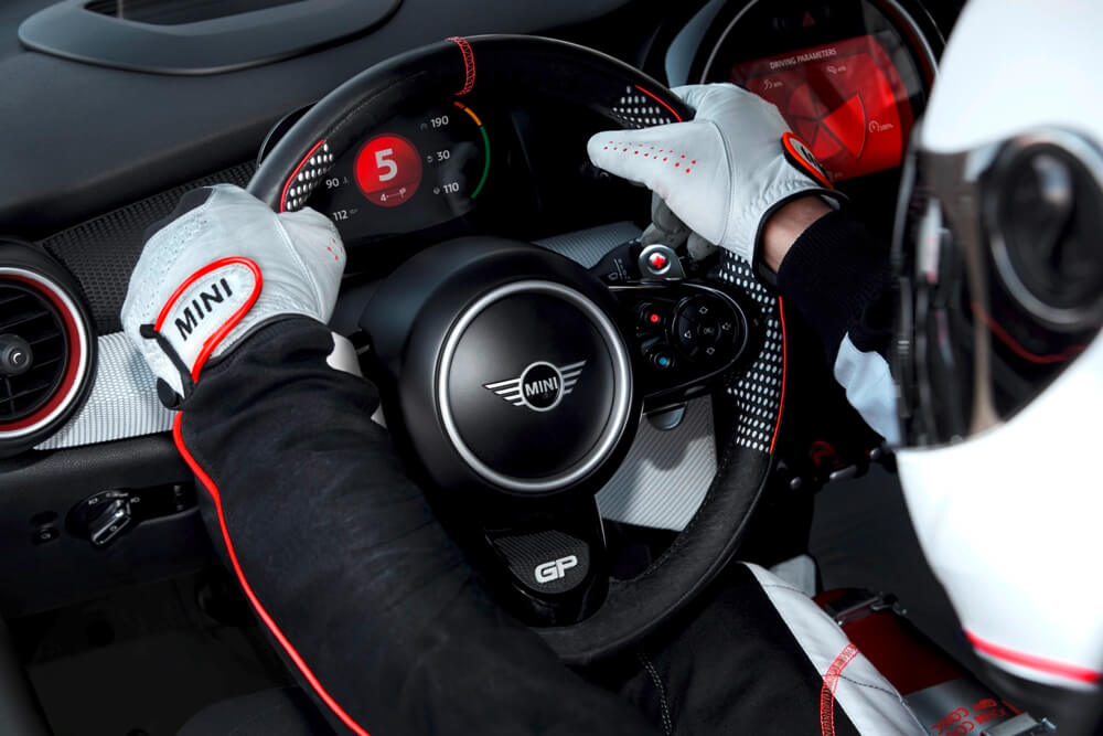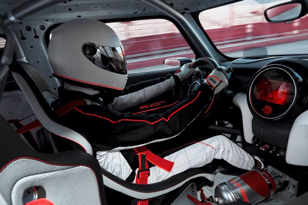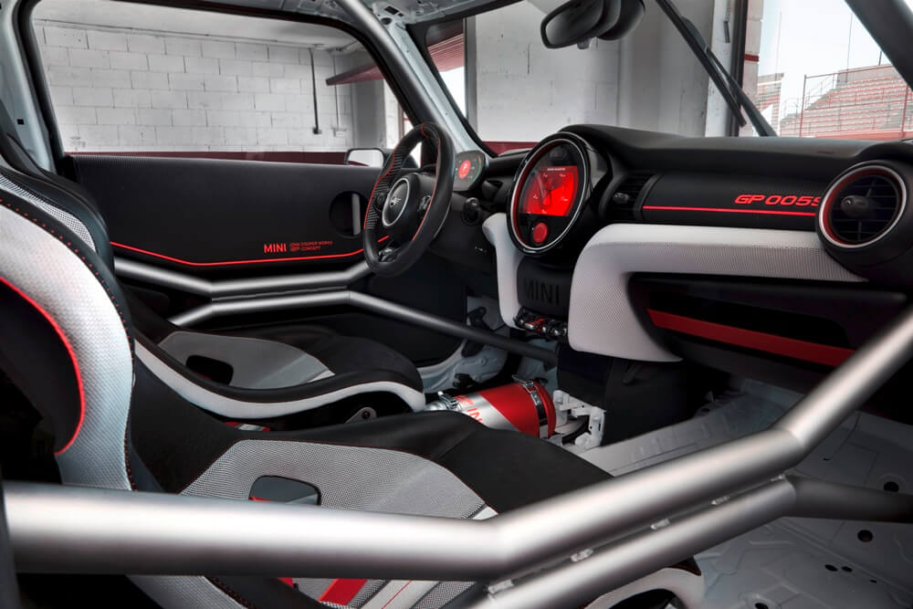 En cuanto al interior, MINI ha decidido despojarlo de todo lo innecesario para horrar peso y, en su lugar, ha instalado una jaula antivuelco de aluminio y una pareja de asientos de carreras con arneses de cinco puntos de anclaje. El conductor cambia de marcha con las levas tras el volante y puede ver toda la información en el cuadro de instrumentos especialmente diseñado o en el sistema Head-Up Display. Para salir del habitáculo, los ocupantes emplean las correas de tela en las puertas en lugar de los tiradores convencionales, todo ello para ahorrar peso.