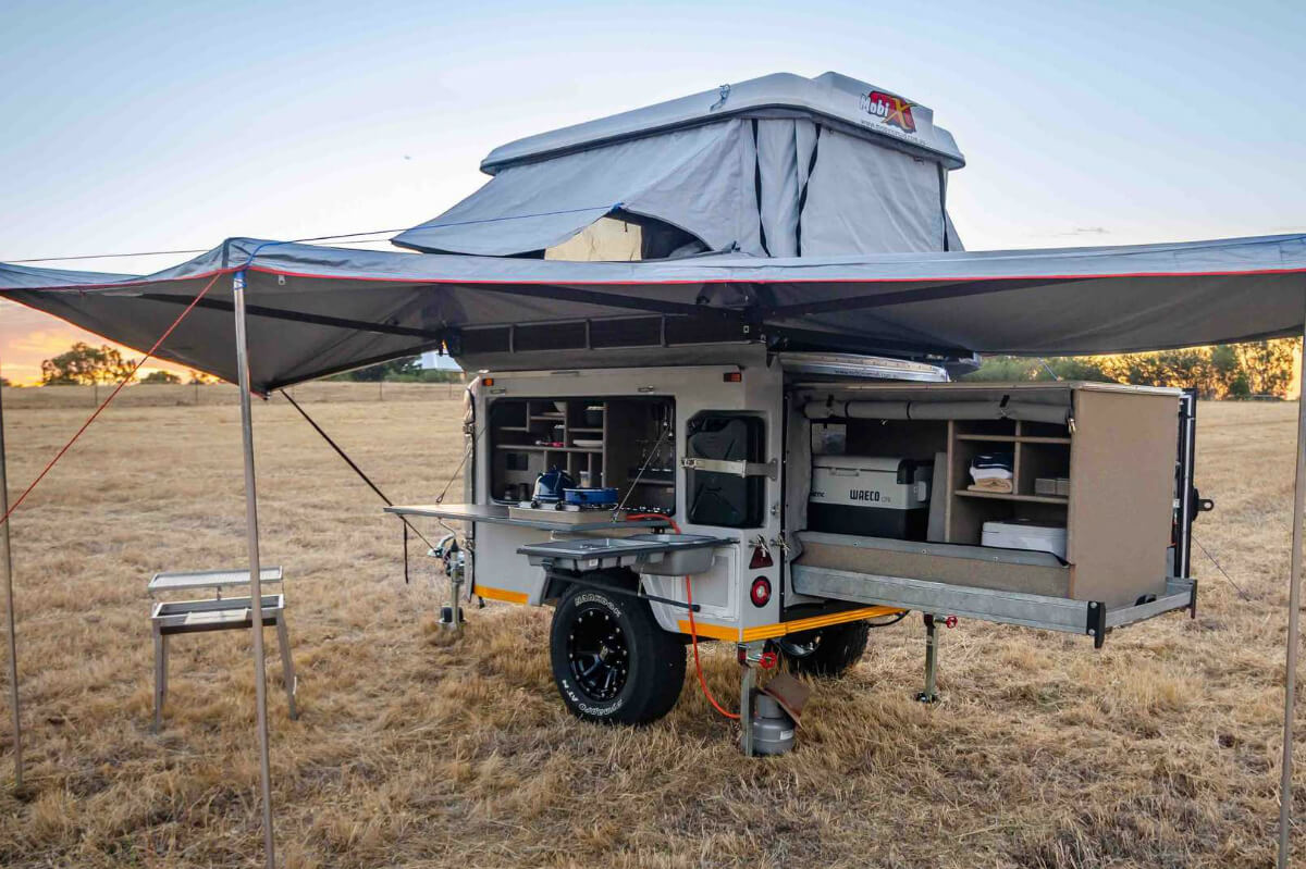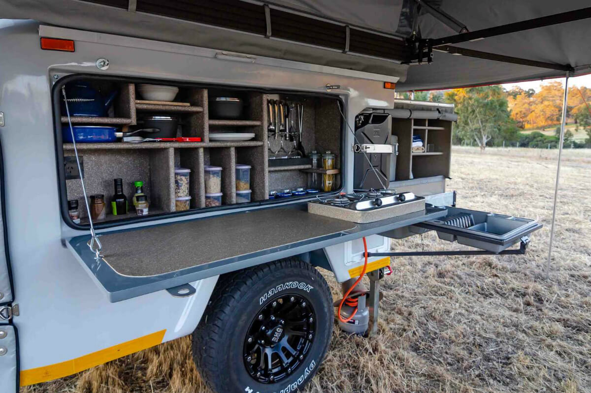 Cuando entra en acción, el Mobi X sufre una total transformación impresionante. Su sección frontal es deslizable y uno de sus lados se despliega descubriendo una cocina exterior con todo lo necesario: fuegos, fregadero, espacio para almacenar platos y los utensilios de cocina básicos, la posibilidad de incorporar un pequeño frigorífico… A esto hay que añadir un toldo exterior y un baño plegable de lona equipado con una ducha al aire libre y un inodoro portátil.