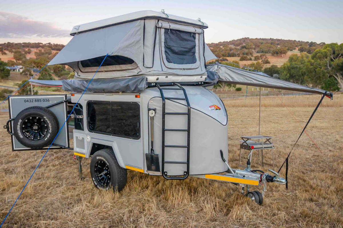 Este pequeño remolque está repleto de almacenamiento para llevar el equipo de campamento básico en el que, efectivamente, está incluida la tienda. En cuanto al espacio destinado al alojamiento, la capacidad máxima es de seis personas: dos en el interior al que no le faltan detalles, otras dos en la carpa lateral y un par más en el hueco que se puede habilitar en la parte superior.