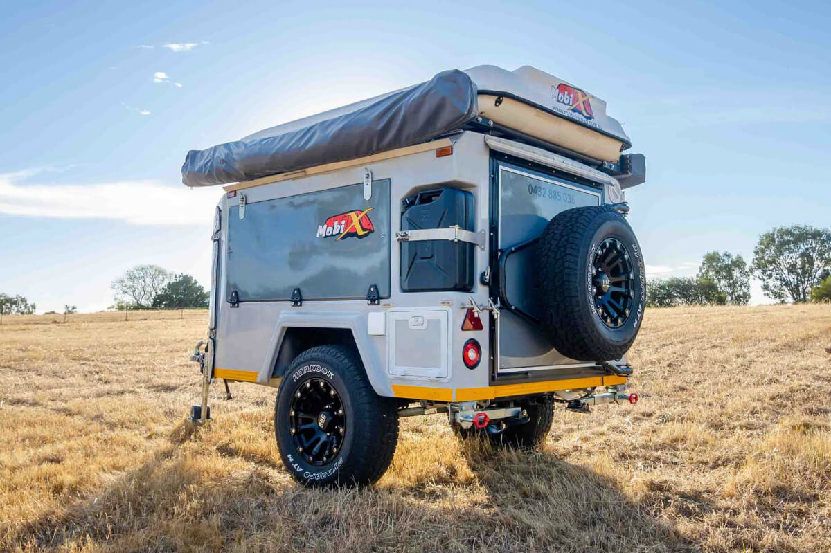 A simple vista para el típico pequeño remolque de camping: pesa 760 kilos ya que su estructura es de fibra de vidrio. Utiliza una configuración de un solo eje y sus llantas de 16 pulgadas calzan unos neumáticos aptos para cualquier escenario, que convierten al Mobi X en un complemento todoterreno.