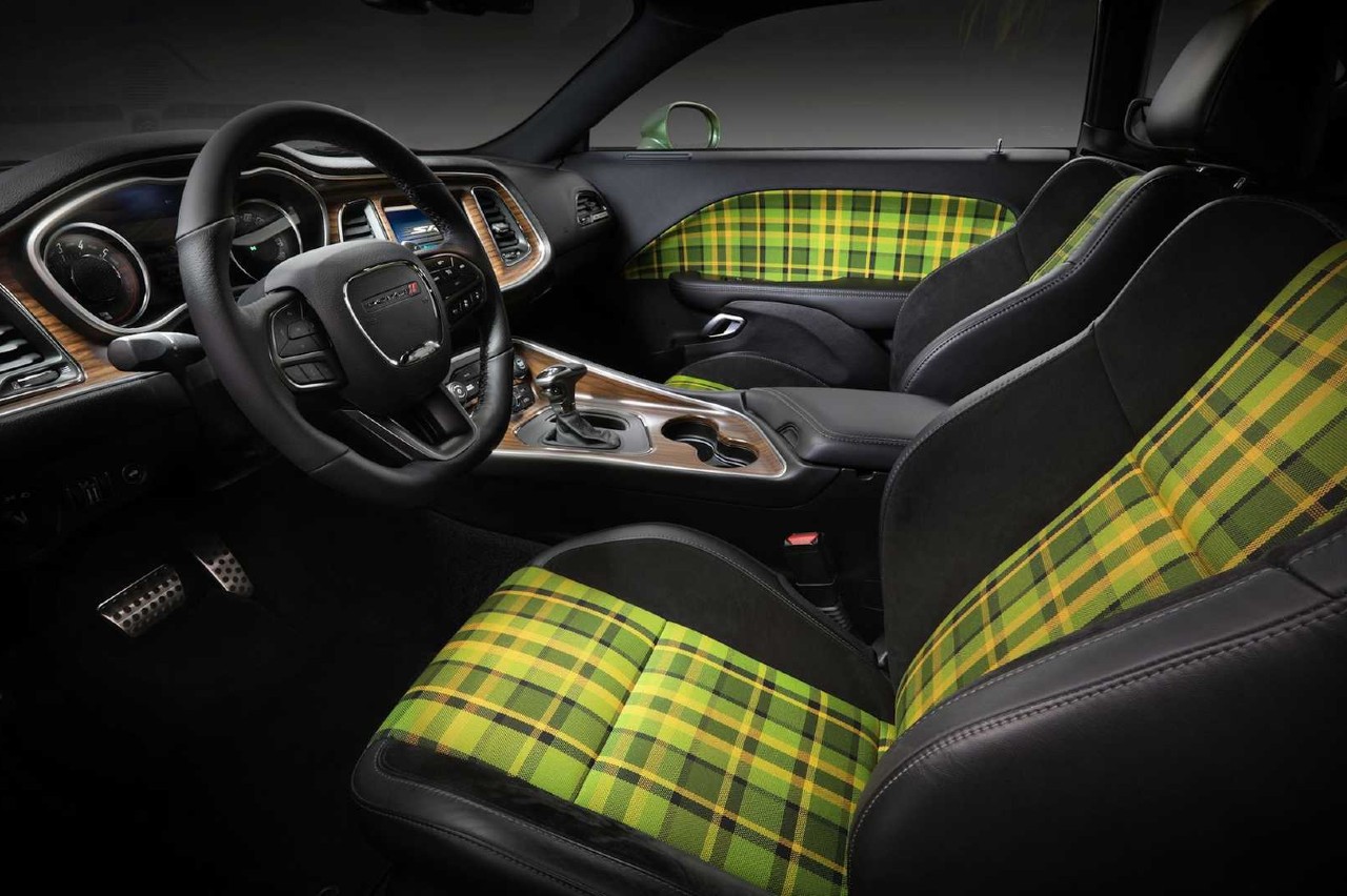 Uno de los prototipos más espectaculares es este Dodge Challenger Holy Guacamole, basado en el R/T Scat Pack Widebody de producción limitada. Su principal característica es el tono verde personalizado, llamado Rotten Avocado, inspirado en el guacamole. En el interior, también destacan el tejido de los asientos y de los paneles de las puertas, en cuadros verde y amarillo.