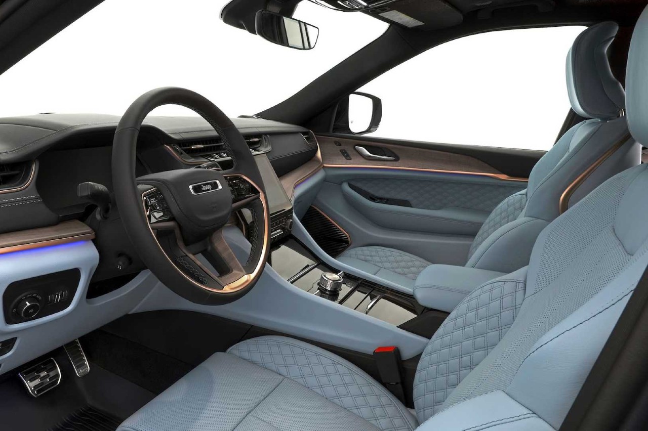 El pasado enero debutó el Jeep Grand Cherokee L con tres filas de asientos y este modelo ha servido ahora de base para crear este concept Breckenridge, con dos tonos de pintura con detalles en bronce satinado en la parrilla y en el logo. En el interior encontramos la misma combinación de colores, con presencia del negro, el azul e inserciones en bronce satinado, así como molduras de raíz de nogal.