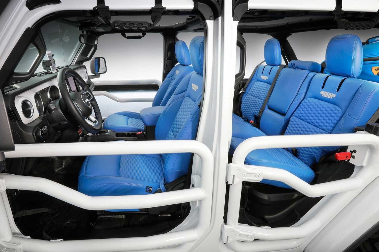 Otro modelo de la marca norteamericana, su flamante Wrangler híbrido enchufable, aparece con una versión más poderosa, con una mayor altura libre al suelo, neumáticos de 37 pulgadas, parabrisas Gorilla Glass y luces LED adicionales, entre otros elementos. El interior ofrece un look personalizado, con un suelo de vinilo y asientos azules.