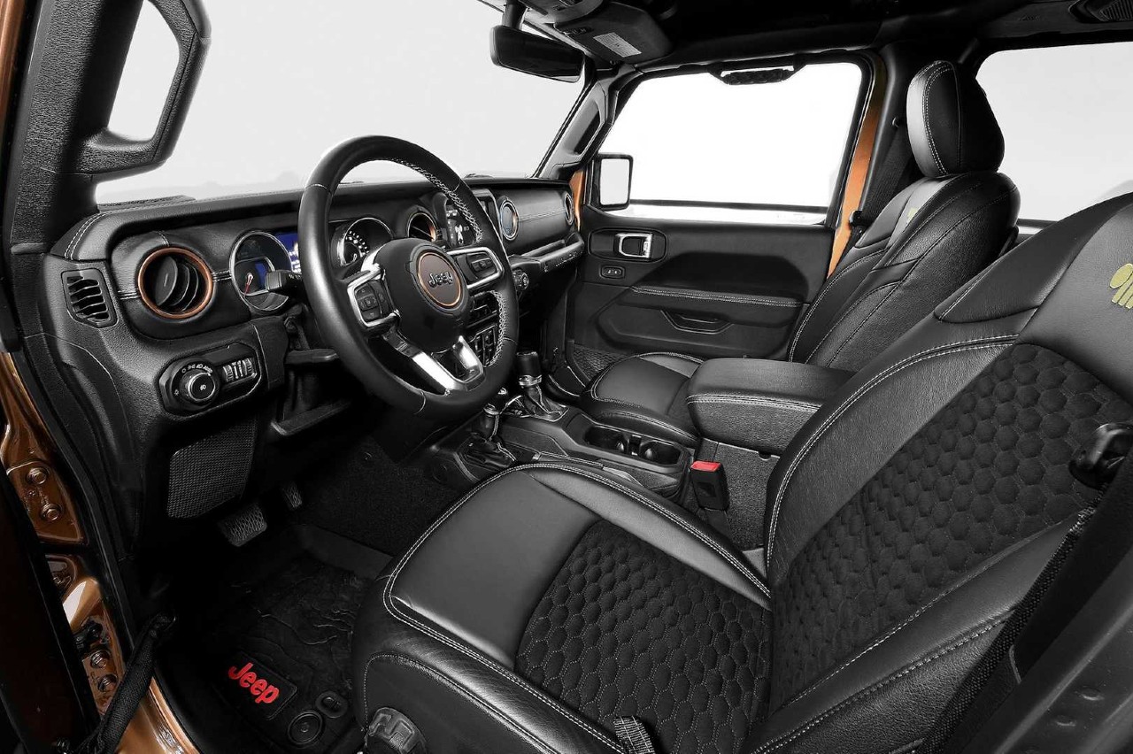 El Wrangler Overlook se estira para albergar una tercera fila de asientos y el techo también aumenta la altura para mejorar la habitabilidad a bordo. El techo sobreelevado cuenta con una superficie acristalada laterales para mejorar la visibilidad. Incluye también neumáticos de 37 pulgadas BFGoodrich KM3 especiales para todoterreno. En el interior, encontramos unos asientos de cuero negro con costuras en contraste de color bronce.