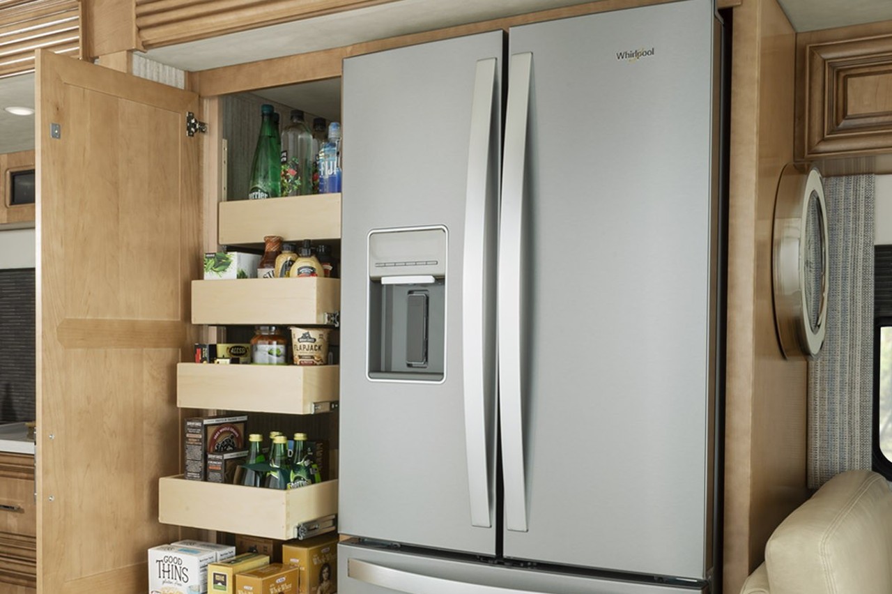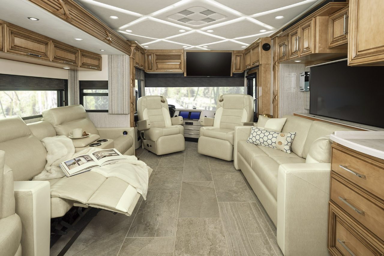 Las plazas delanteras se pueden girar hacia atrás, dando a un salón de gran tamaño, que tiene sofás en ambos laterales, armarios en la zona superior y una tele un lado. Por detrás está el pequeño comedor, con hueco para cuatro personas y una mesa; así como una completa cocina (fregadero, nevera, horno, etc.). Le sigue el baño con un cuarto de lavandería (tiene incluso lavadora y secadora) y justo al final está una habitación con cama ‘king-size’ y sus propios armarios y televisión.