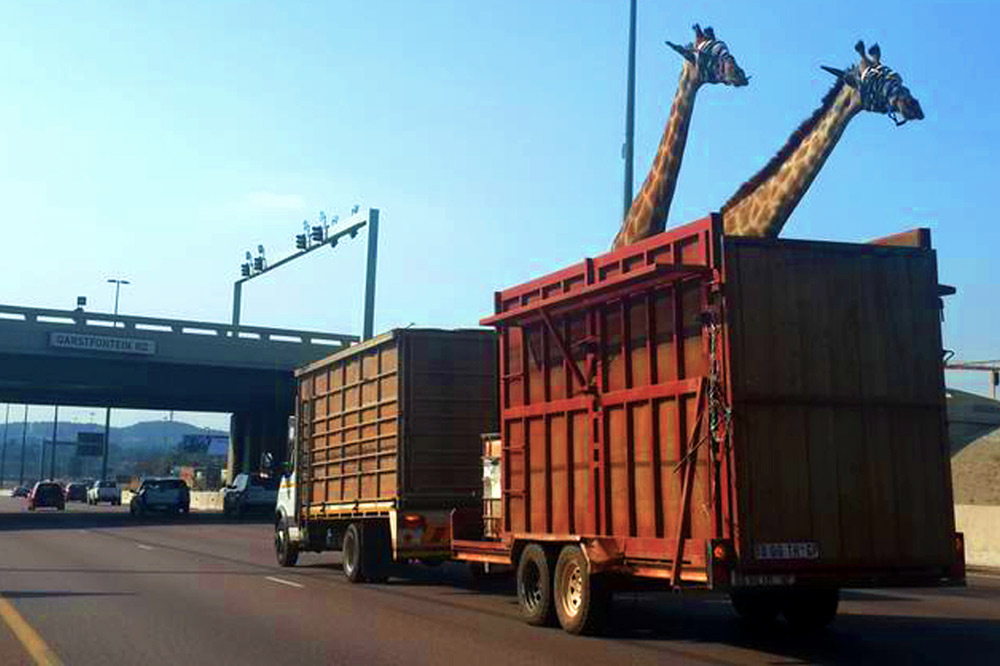 En ocasiones, la realidad supera a la ficción. Una jirafa ha muerto tras chocar contra un puente en Sudáfrica. El conductor del camión que transportaba a dos de estos mamíferos en un remolque sin techo no tuvo en cuenta la altura de los animales y la cabeza de uno de ellos colisionó violentamente contra un puente. Según la BBC, tras el impacto, ambos rumiantes fueron trasportados al veterinario pero uno de ellos murió antes de llegar.