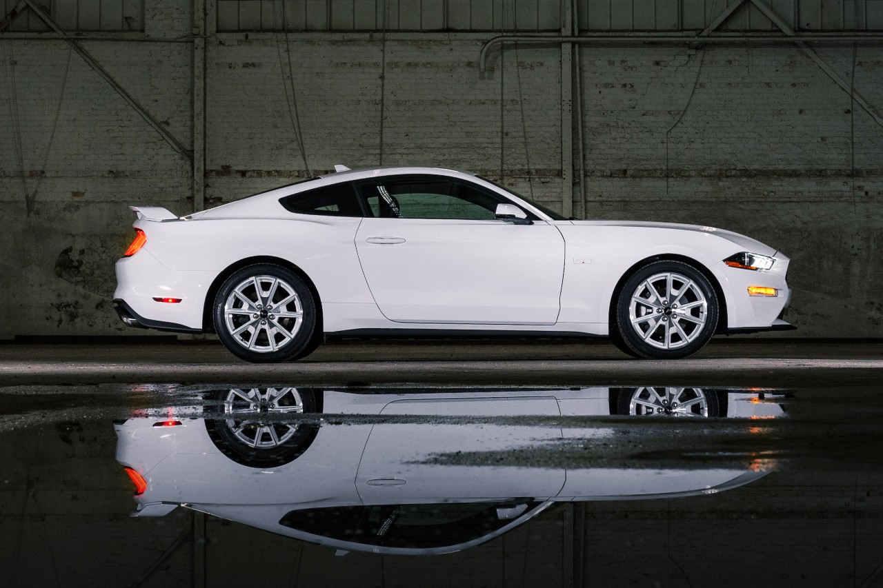 En este caso está disponible en el acabado EcoBoost, así como en el GT, y lleva pintura Oxford White. En el mismo tono encontramos también las llantas, de diseño 'vintage' y 19x9 pulgadas, y los emblemas del pony. Además de que los pilotos traseros se han aclarado.