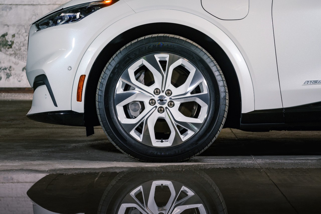 En cuanto al Mustang Mach-E, está pintado en un tono algo distinto: Star White Metallic Tri-Coat. Por contra, los logos son, como en el coupé, en Oxford White. Al igual que los acentos en blanco que llevan las llantas de aluminio de 19 pulgadas. La tapicería, sin embargo, es de un gris pálido, llamado Light Space Gray, que se extiende por asientos, consola central y tiradores de las puertas. Y el volante lleva también un pony, una vez más en riguroso blanco.