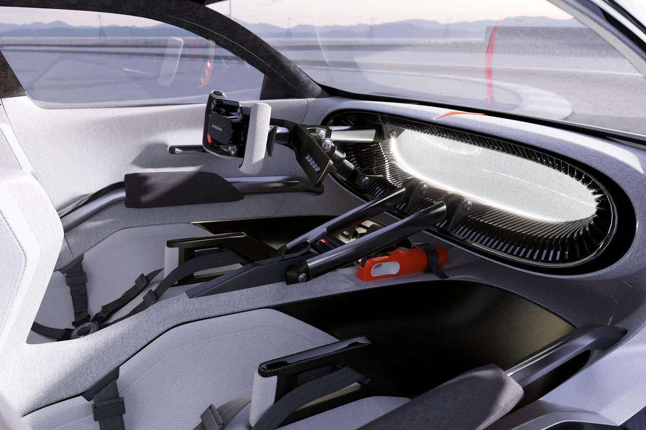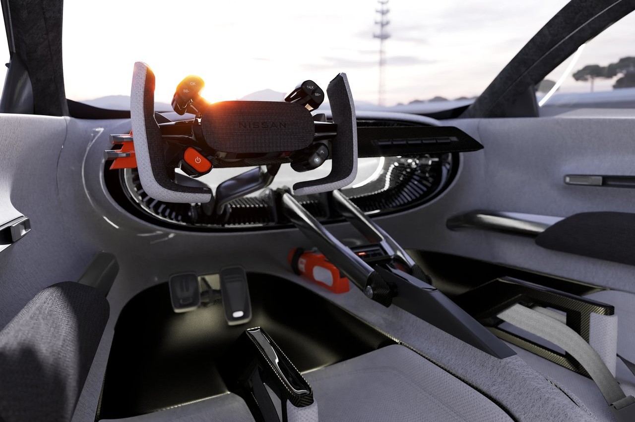 El Concept 20-23 es sólo un modelo exterior. Sin embargo, los diseñadores han creado también un interior que refleja el carácter deportivo y extremo del exterior. Para empezar, el acceso se a través de unas puertas con apertura de tijera. Una vez dentro, encontramos dos asientos de cubo que ofrecen una gran sujeción, según Nissan, tapizados con un tejido casi blanco y con un gran reposacabezas que recuerda a los coches de carreras. También tiene un volante deportivo rectangular adornado con múltiples controles y ajustes. Detrás, hay unas levas para controlar el rendimiento del motor, del que la marca no ha dado ninguna información.