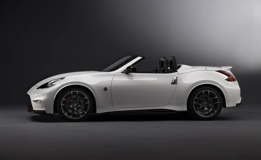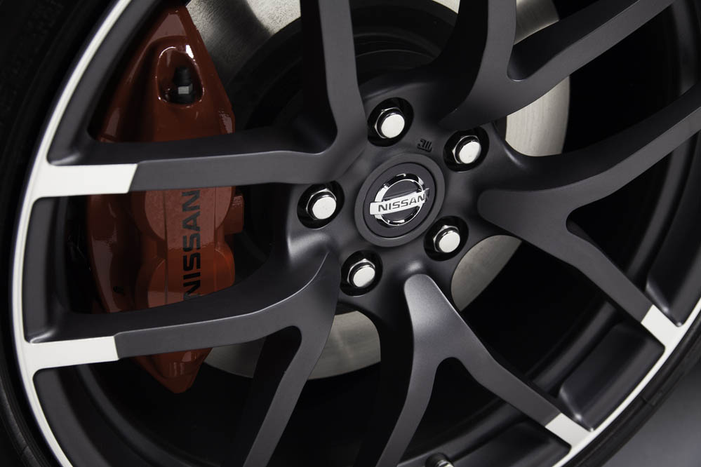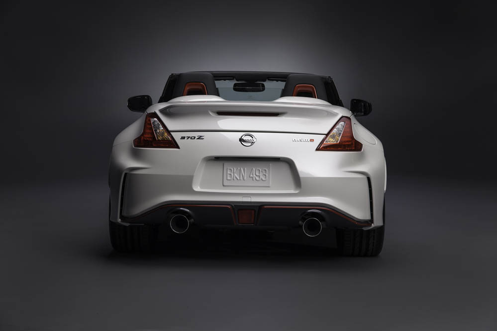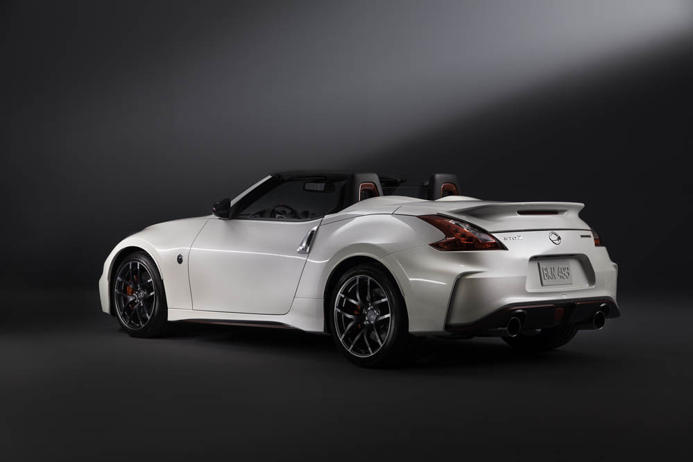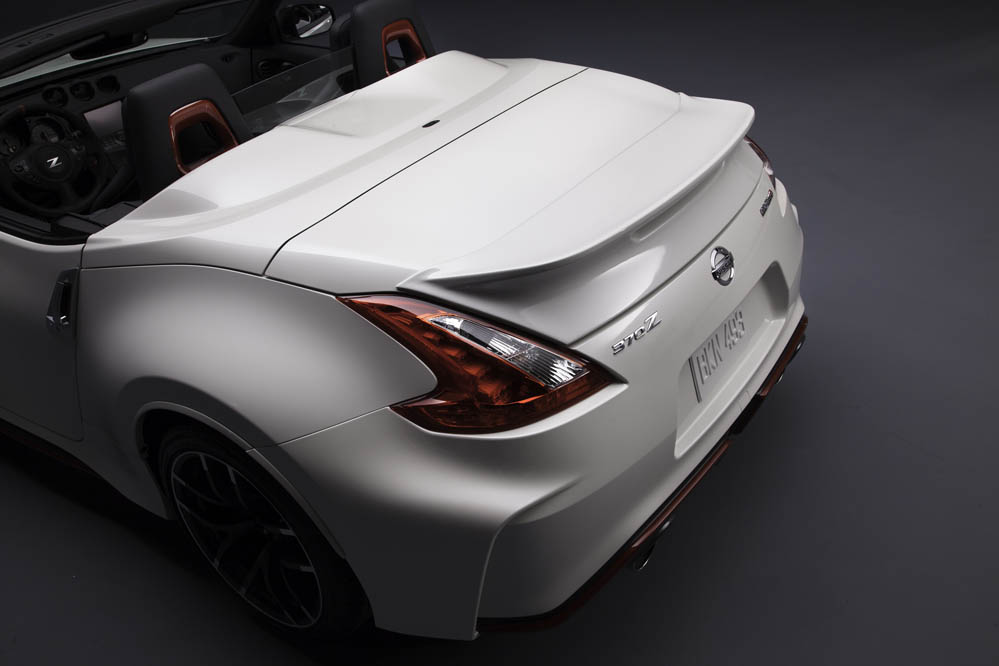 Esta versión con techo de lona guarda gran parecido con el 370Z Nismo: paragolpes, llantas ‘Rays’ de 19x9.5 las delanteras y 19x10.5 las traseras, ambas con neumáticos Bridgestone Potenza S001 (245/40R19 eje anterior y 285/35R19 en el posterior, asientos tipo bacquet firmados por Recaro, detalles en la consola… todo es exacto al coupé; todo menos el alerón posterior, que está realizado en fibra de carbono y que ha sido acoplado para maridar a la perfección con la zaga.
