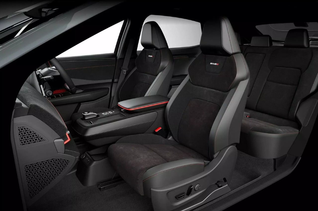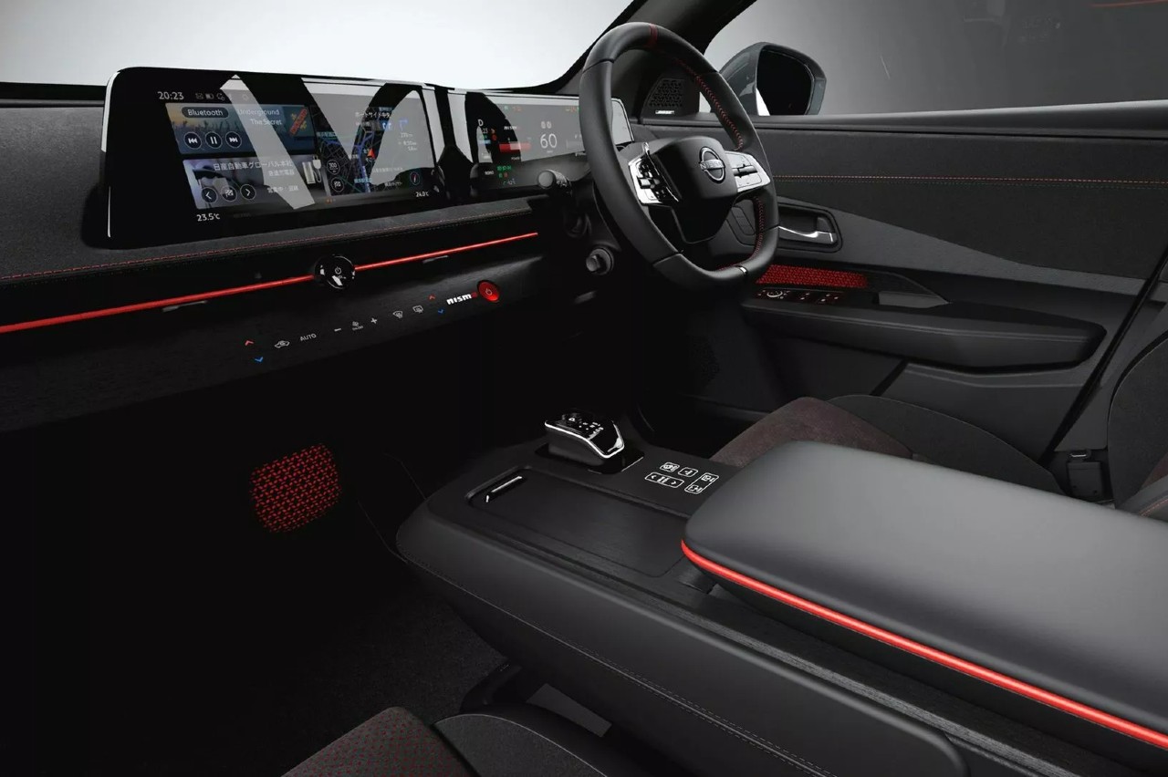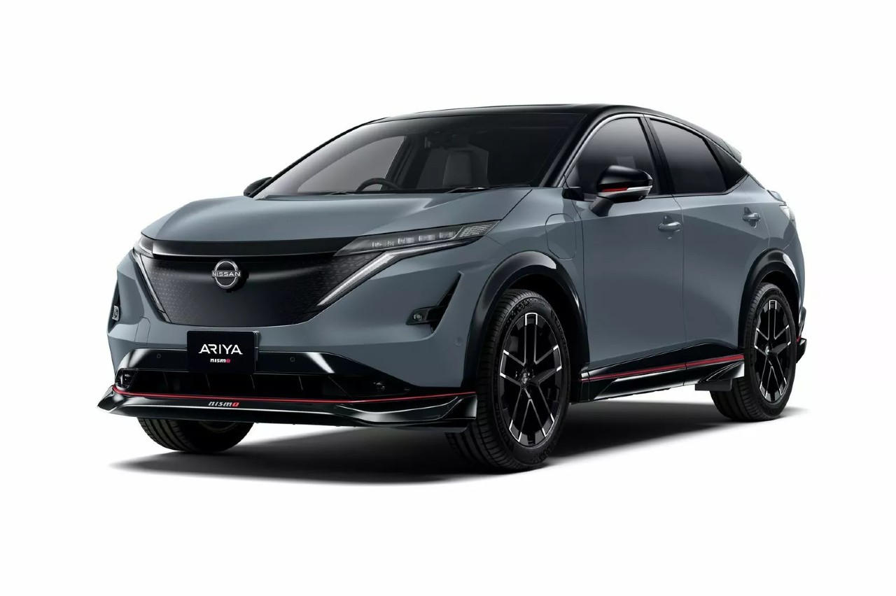 Las fluidas formas del Ariya reciben el tratamiento Nismo para resaltar su carácter más deportivo, aunque de una manera sutil. El paragolpes delantero se modifica y añade un splitter con una fina franja roja, formato que también adoptan los faldones laterales y el difusor trasero. Las llantas son específicas y de 20 pulgadas, y también reciben modificaciones los alerones, pues ahora son dos, uno situado al final del techo y otro sobre la tapa del maletero.