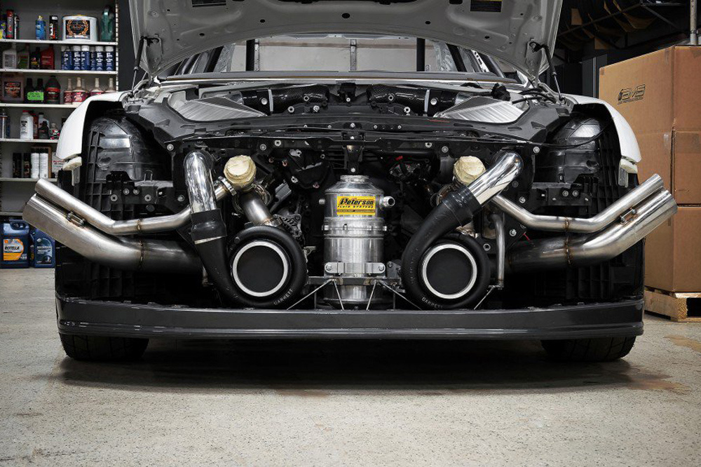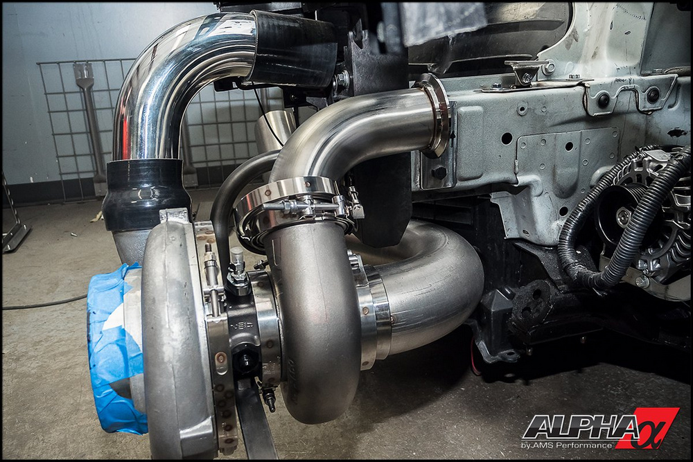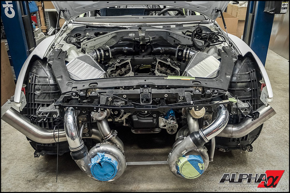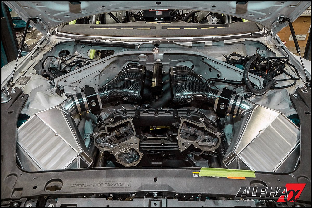 Este Nissan GT-R AMS Alpha G tiene un bloque 3.8 V6 Alpha VR38 forjado, construido específicamente por AMS y que se nutre de gasolina y aire gracias a dos enormes turbocompresores Garret GTX. Prácticamente todos los componentes del motor han sido creados o modificados para la ocasión para poder soportar semejante cantidad de potencia, al igual que la caja de cambios y la transmisión.