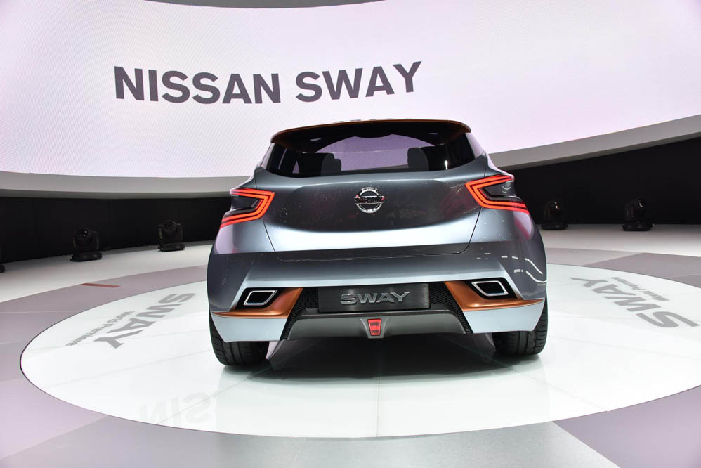 En el exterior del Sway destacan elementos como la parrilla en 'V', el techo de cristal, los faros extremadamente finos y alargados y el pilar C con sus formas acentuadas. Visto desde el lateral, la musculosa línea que nace desde la parrilla se acentúa en las puertas y continúa por el portón del maletero. Las llantas, de generosas dimensiones, evocan los diseños más atractivos de Nissan. En la zaga, los afilados faros en forma de cuña, los acompañan las dos salidas de escape posicionadas en el paragolpes trasero y el difusor central. Otra de las características del Sway Concept es la ausencia del pilar B y las puertas traseras estilo suicida, lo que otorga una mayor amplitud y una fácil acceso a las plazas posteriores.