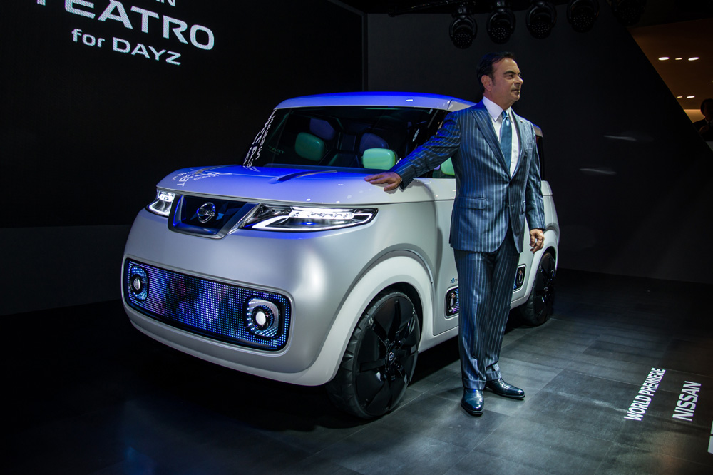 El Nissan Teatro for Dayz presenta un exterior muy al estilo de los kei-car japoneses, con unas dimensiones contenidas y un diseño anguloso. La carrocería está rematada en una combinación de blanco satinado y brillante e incorpora una reinterpretación del característico frontal de los últimos productos del fabricante japonés, con una parrilla en forma de V flanqueada por unos grupos ópticos con luces de LED. Las puertas delanteras son convencionales, pero las traseras se abren en sentido opuesto.